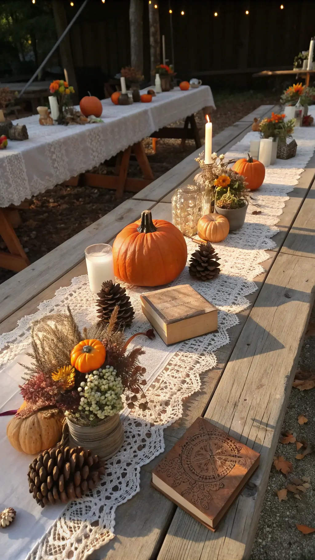 Mini pumpkins, pinecones, leaf garlands, and seasonal fruits.
