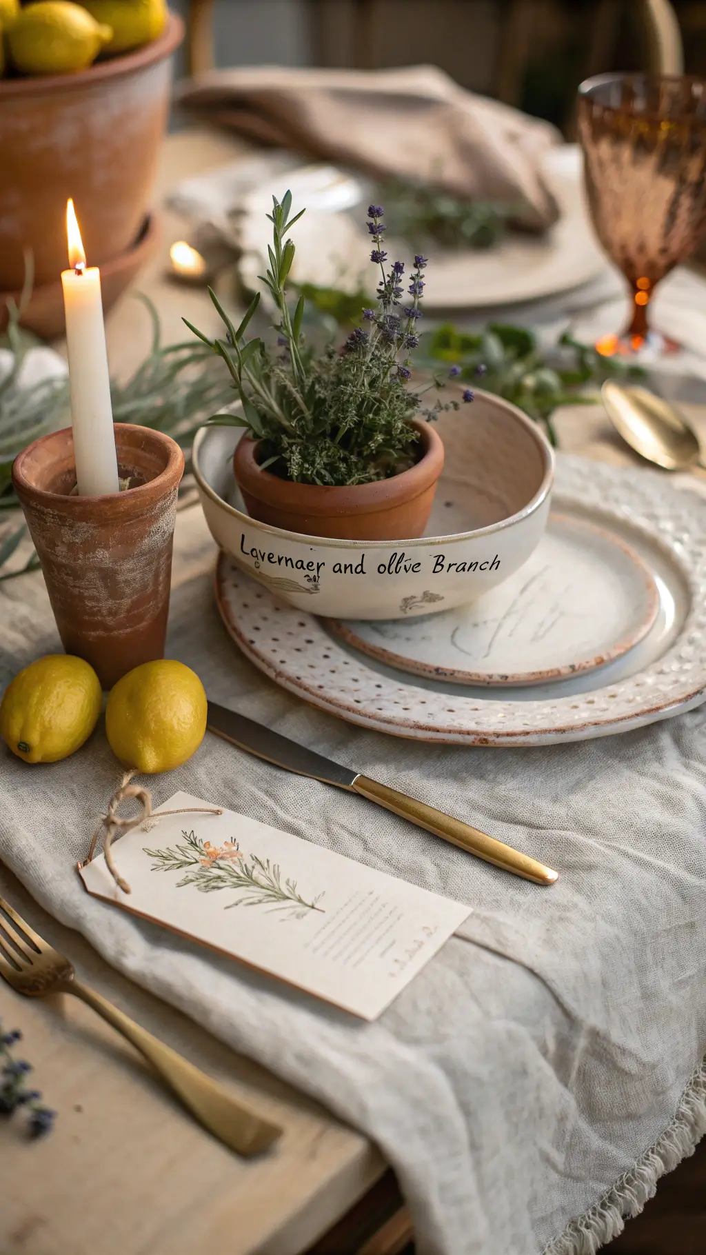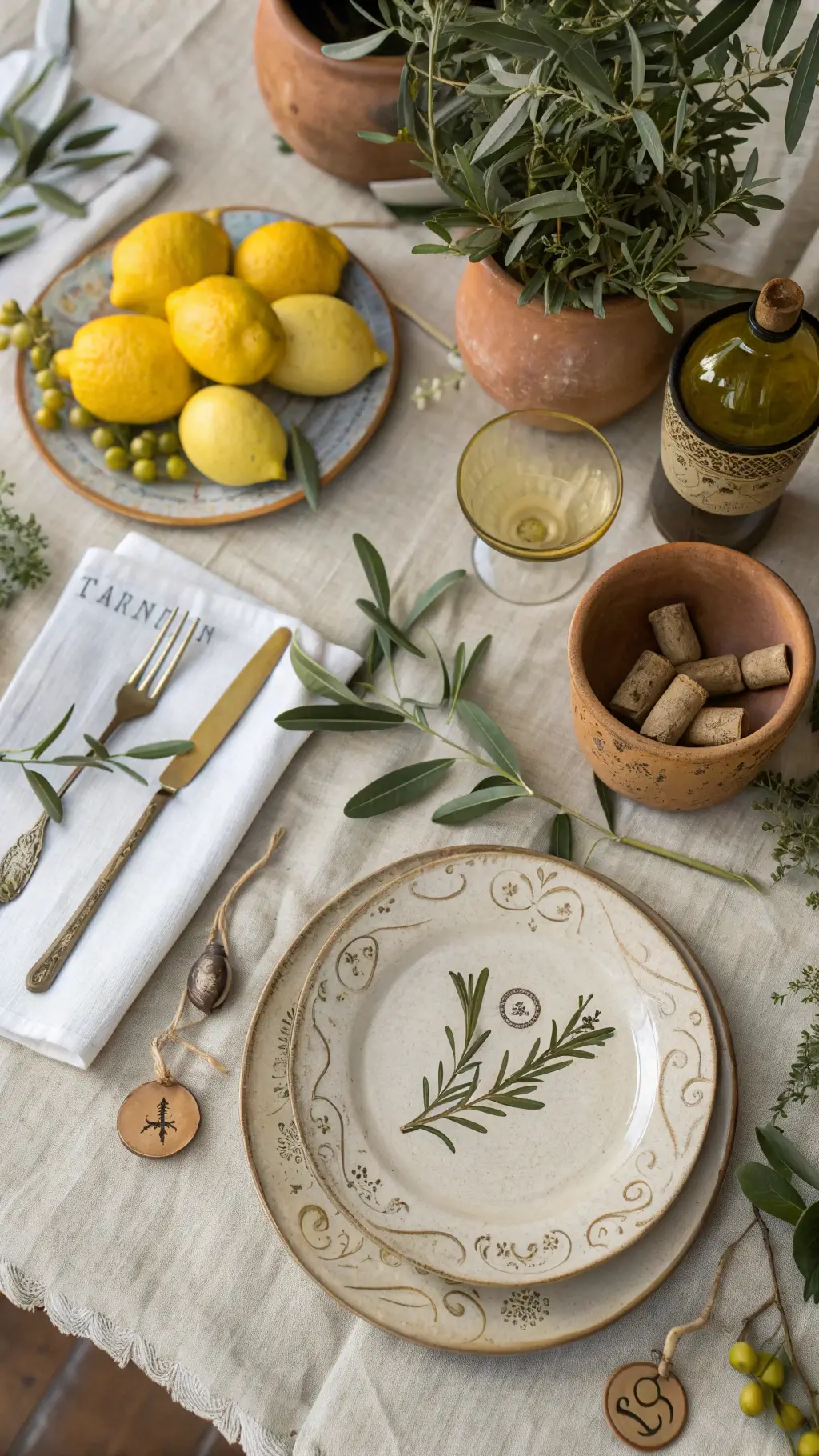 - Abundant fresh elements: olive branches, lemons, seasonal flowers, herbs