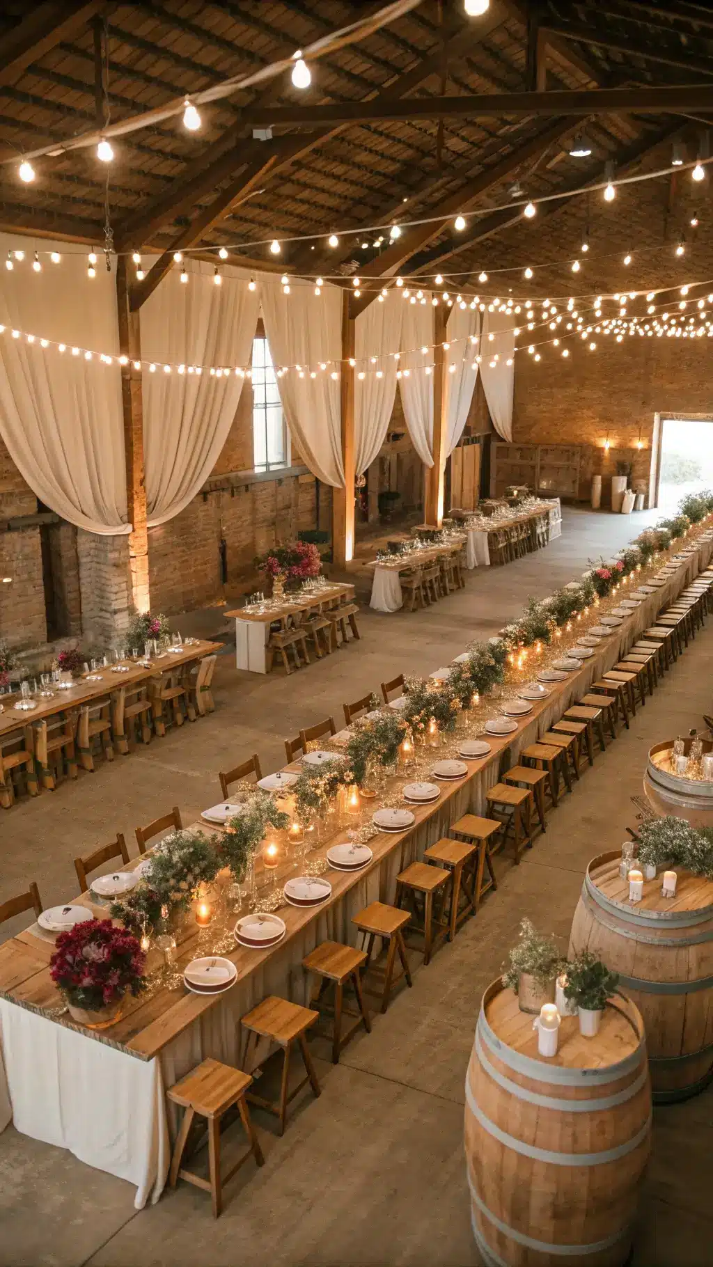 Wine barrel cocktail tables scattered around your space create perfect gathering spots during cocktail hour.