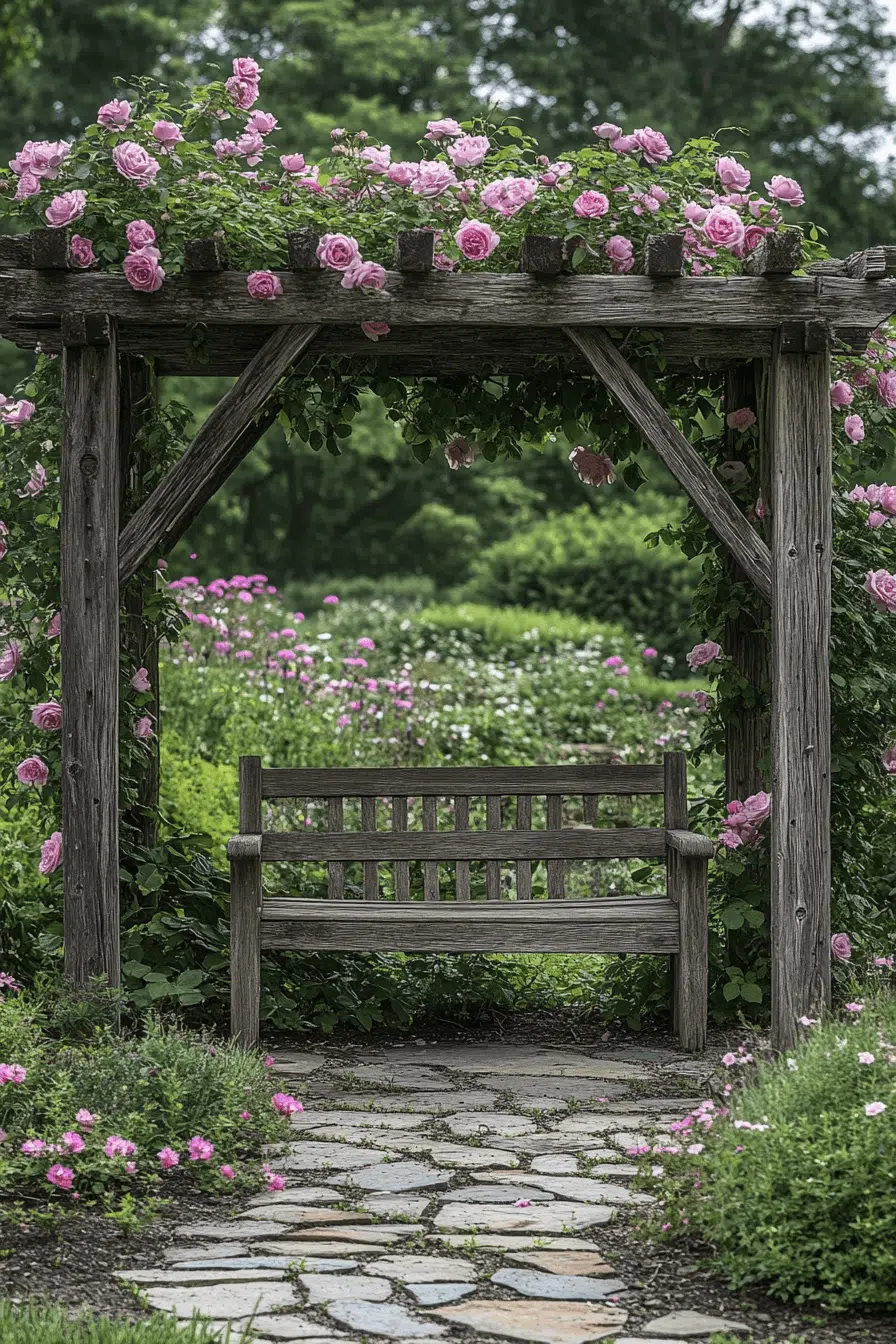 Create a romantic garden transition with antique yard decor ideas featuring weathered wood arbors. Climbing roses or wisteria add fragrance and visual softness. The aged wood finish enhances the storybook feel. Vintage seating beneath turns the arbor into a cozy pause point. Every path feels intentional and inviting.