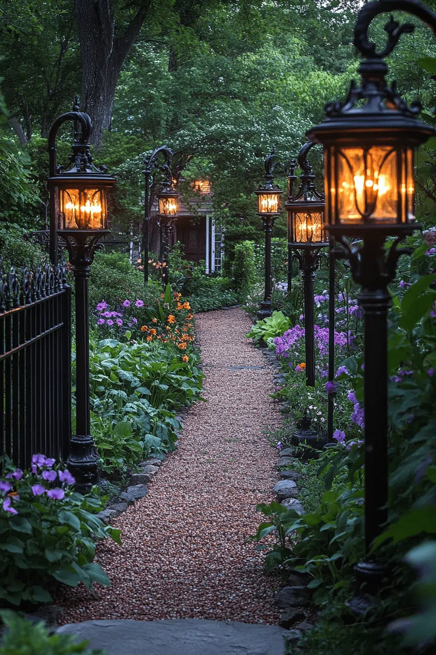 Illuminate evenings beautifully with antique yard decor ideas featuring ornate outdoor lighting. Lantern-style fixtures cast a warm, historic glow after sunset. Placed along paths or seating areas, they enhance safety and ambiance. Soft light highlights textures and architecture. Nighttime gatherings feel magical and refined.