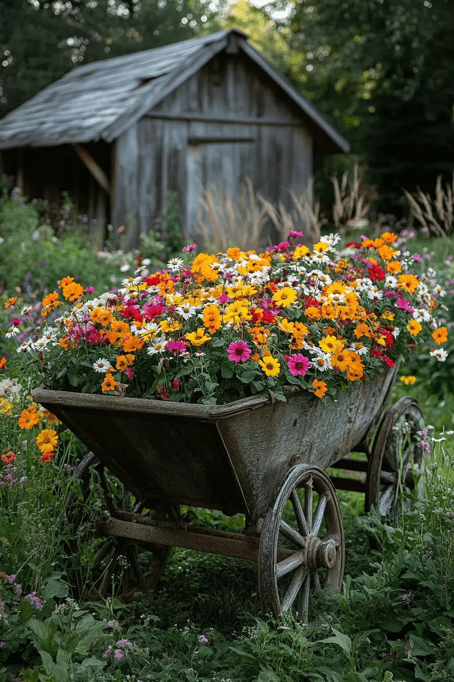 Express creativity through antique yard decor ideas using repurposed garden pieces. An old wheelbarrow becomes a charming planter centerpiece. Filled with flowers, it adds whimsy and movement. The worn patina tells a story of time. Sustainability meets visual interest here.