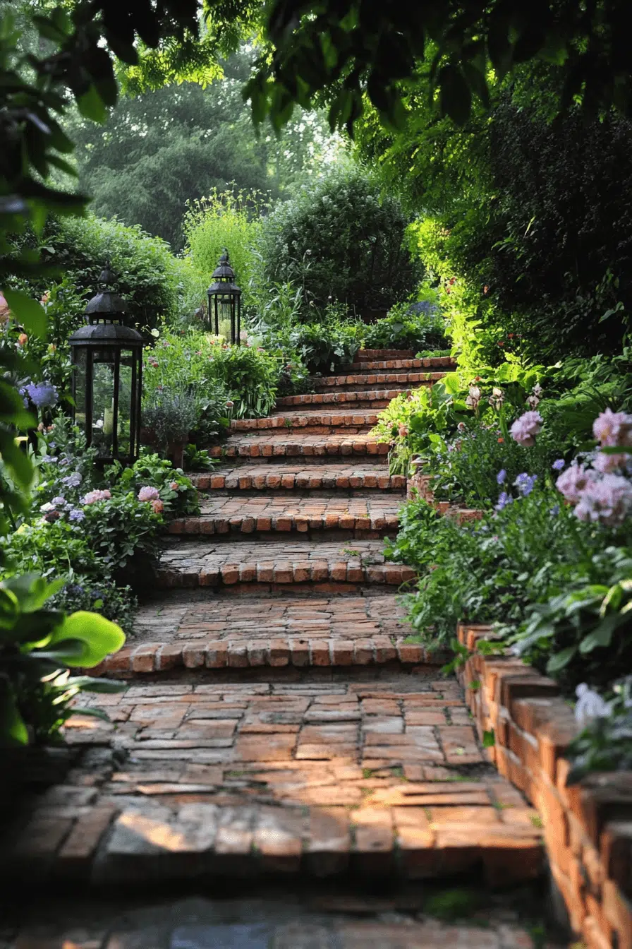 Build character underfoot with antique yard decor ideas using salvaged brick pathways. Worn textures and mixed tones add depth and history. Elegant patterns elevate the design. These paths guide visitors through a story-filled landscape. Framed by greenery, they feel authentic and charming.