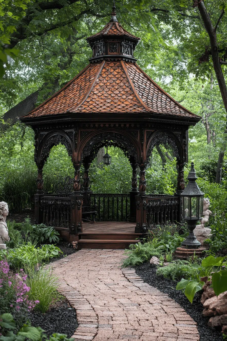 Add architectural beauty to your landscape with antique yard decor ideas featuring classic gazebos. Ornate metalwork or carved wood details showcase craftsmanship from another era. Climbing roses or wisteria soften the structure naturally. Vintage seating beneath invites quiet moments outdoors. The gazebo becomes both functional and visually stunning.
