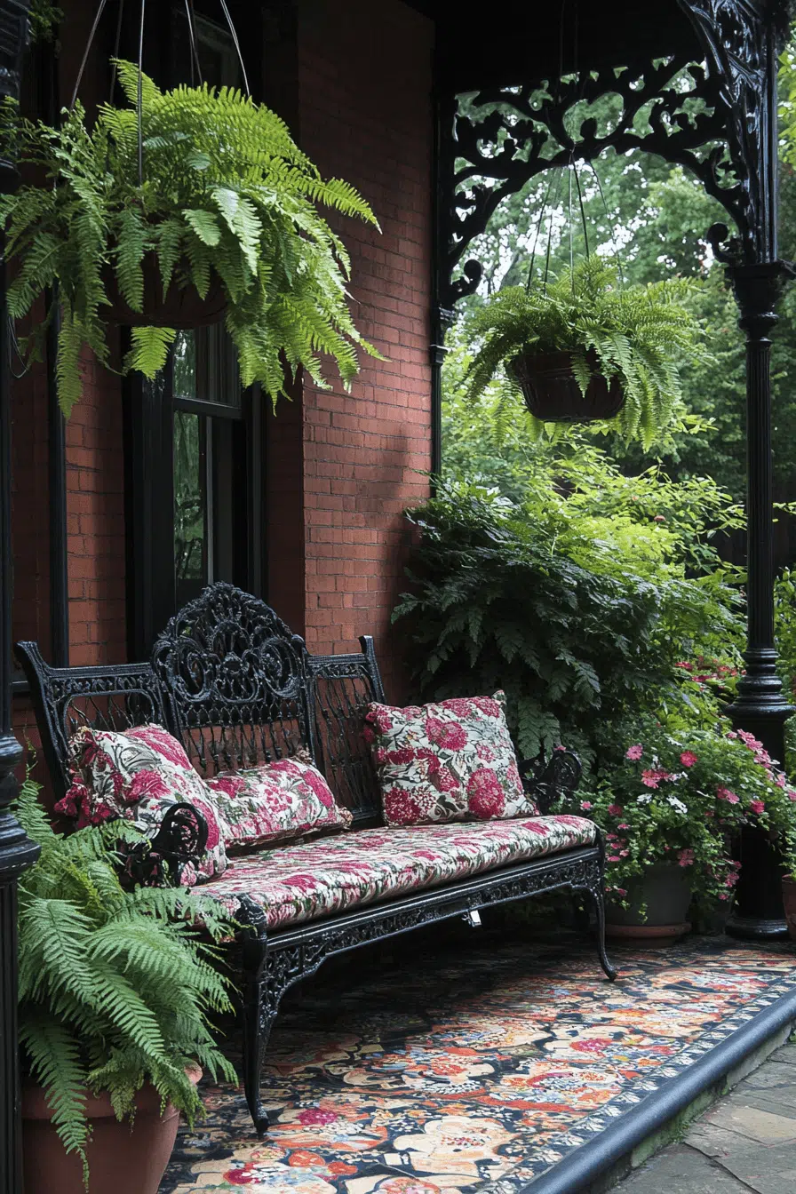 Create layered elegance with antique yard decor ideas influenced by Edwardian terrace gardens. Ferns and palms add lush greenery and softness. Wicker seating paired with floral cushions offers timeless comfort. Decorative tile tables introduce artistic flair. The space feels calm, inviting, and thoughtfully styled.
