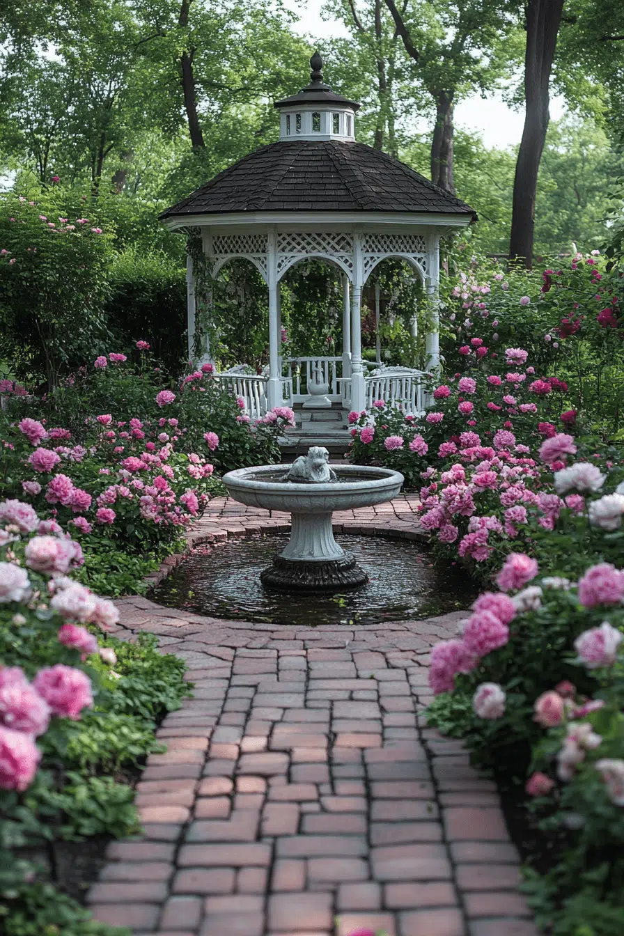 Step back in time by styling your garden with antique yard decor ideas inspired by elegant Victorian landscapes. Ornate iron seating, decorative gazebos, and sculptural statues instantly introduce refined old-world charm. Soft pastel blooms and climbing vines heighten the romantic atmosphere. A classic tiered fountain adds gentle movement and visual grace. The entire space feels nostalgic and beautifully curated.