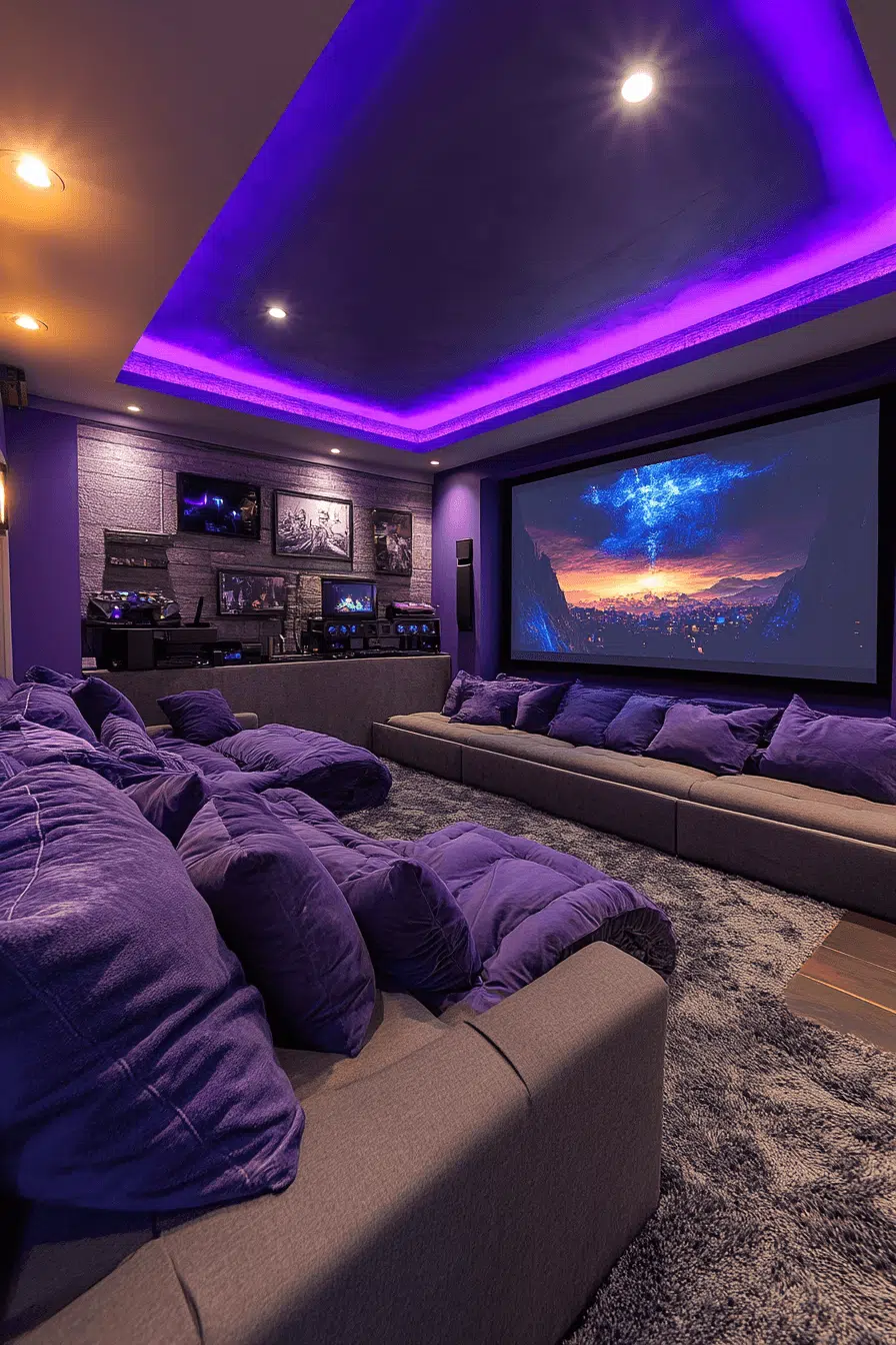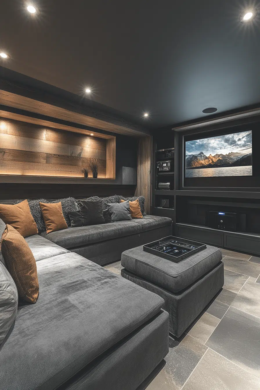 Bring cinematic magic home with basement family room ideas inspired by theater-style comfort. Reclining chairs, a projector screen, and layered lighting create a true movie-night atmosphere. Dark wall colors help reduce glare and heighten the viewing experience. Subtle film décor adds personality without overwhelming the room. These basement family room ideas transform ordinary movie nights into unforgettable events. Explore more immersive basement family room ideas and build your own home cinema.