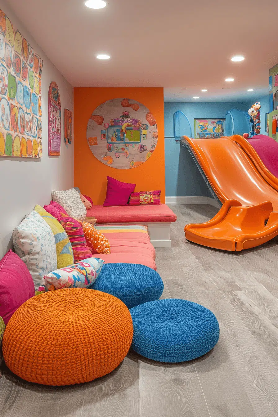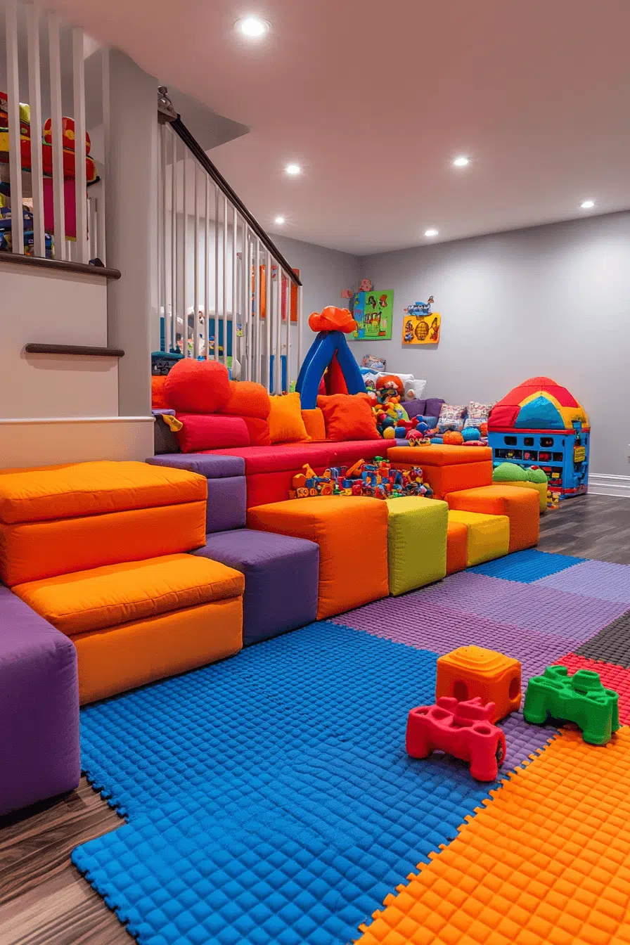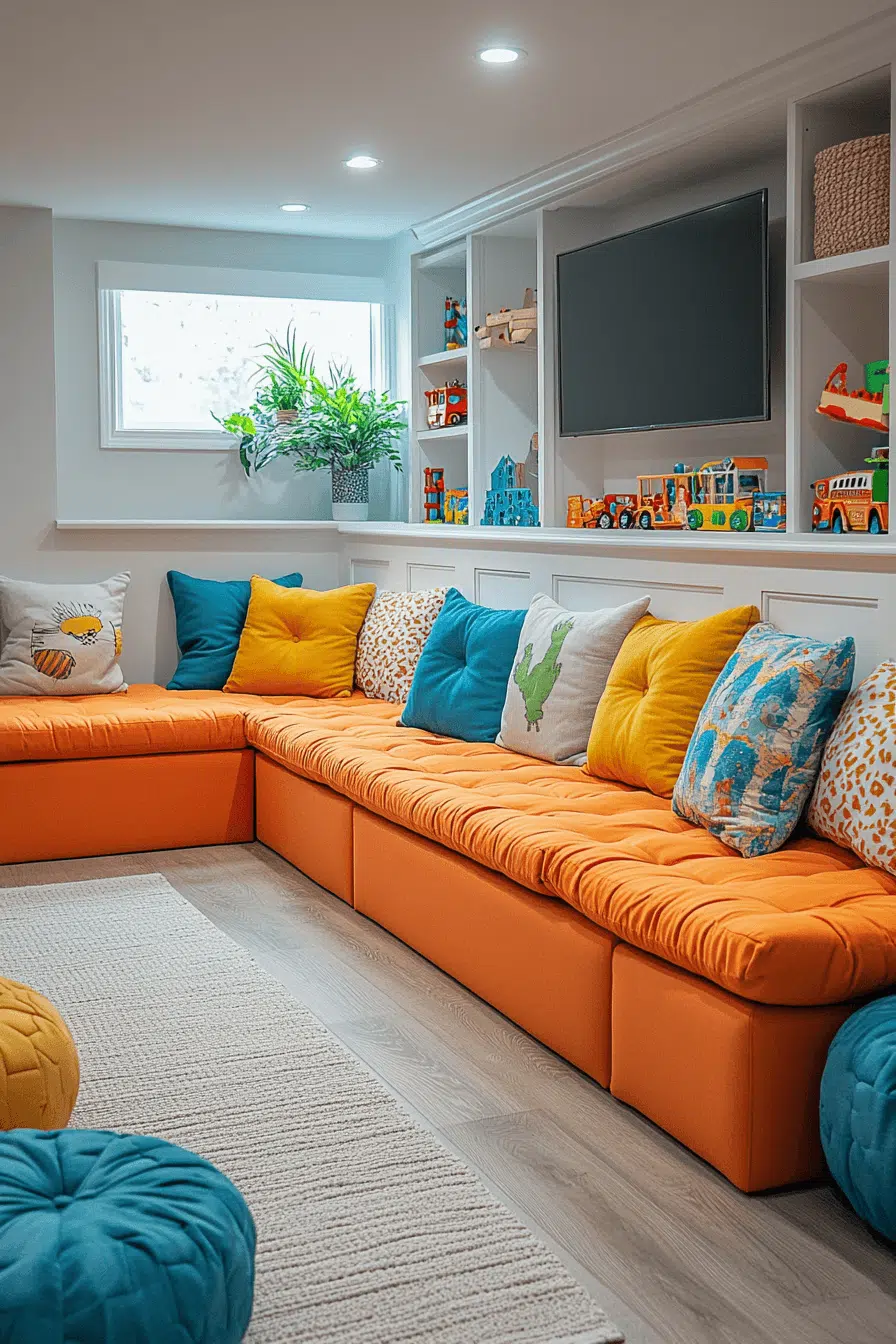 Create a joyful play zone with basement family room ideas designed for kids. Soft flooring, bright colors, and activity stations inspire imagination and movement. Smart storage solutions keep toys organized and easy to access. The layout balances fun and safety for worry-free playtime. These basement family room ideas keep children entertained while maintaining a tidy space. Explore more playful basement family room ideas and design a kid-approved basement.