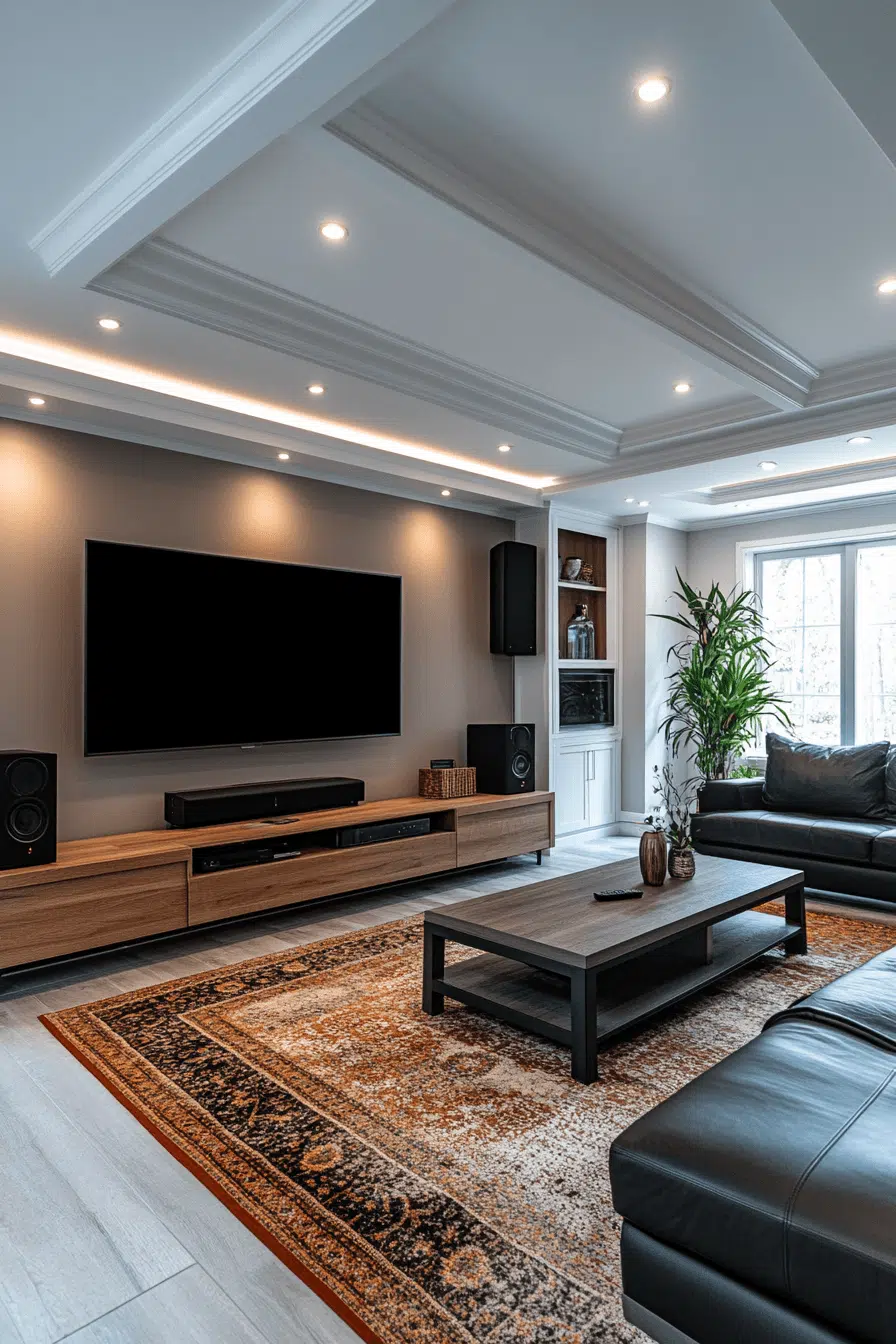 Upgrade entertainment with basement family room ideas that combine gaming and movie nights in one dynamic space. Powerful sound systems, gaming consoles, and cozy seating make the room exciting for everyone. Darker color palettes and acoustic features enhance sound quality and reduce glare. A flexible layout lets the room shift effortlessly between gaming sessions and film marathons. These basement family room ideas are perfect for households that love technology and fun. Explore more high-energy basement family room ideas and level up your basement.