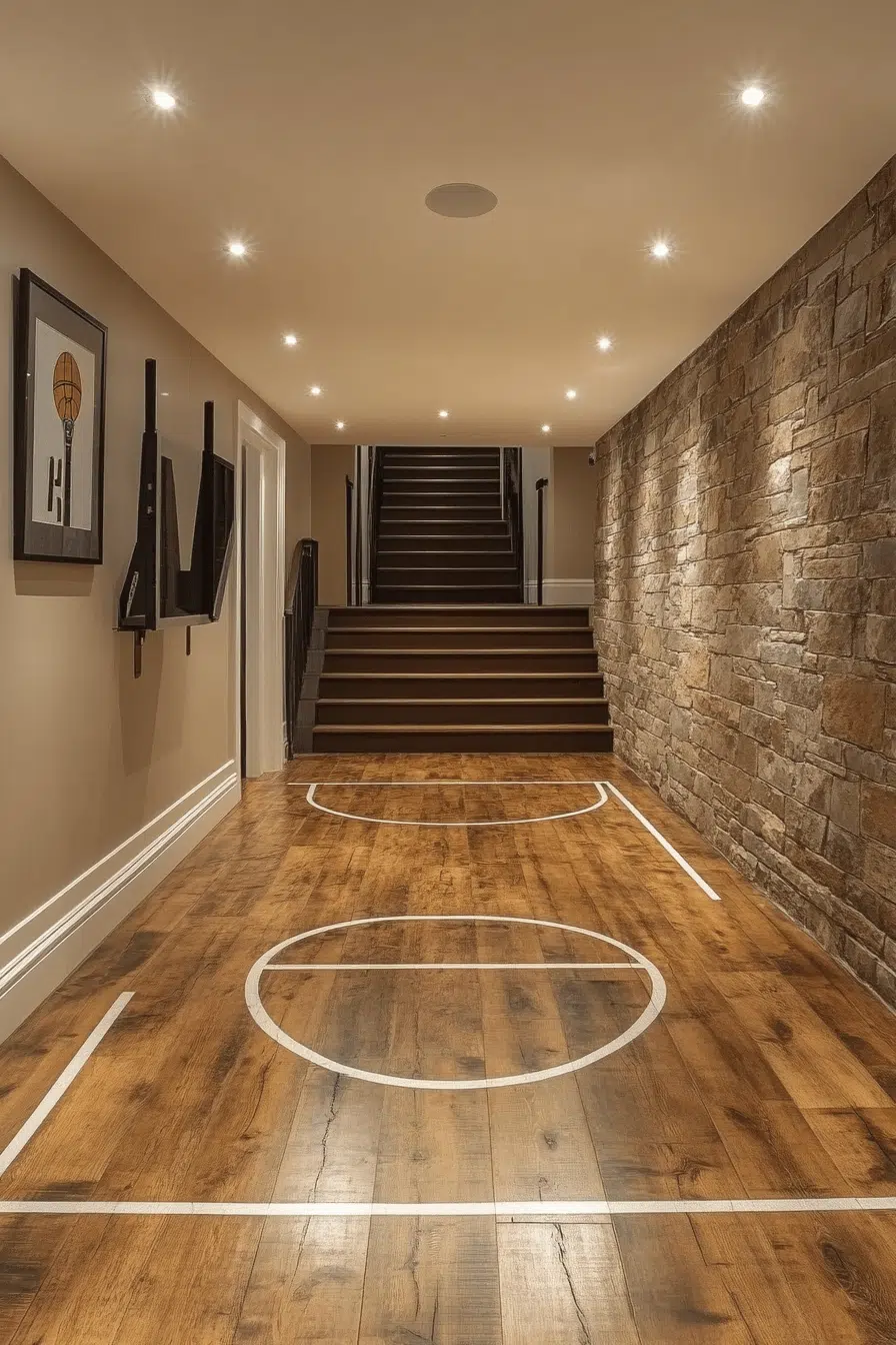 Stay active indoors with basement family room ideas that include energetic sports zones. Cushioned flooring and resilient materials keep activities safe and comfortable. Vibrant accents and themed décor add excitement and personality. The layout encourages movement, games, and friendly competition. These basement family room ideas make the basement perfect for year-round activity. Explore more dynamic basement family room ideas and bring energy into your home.