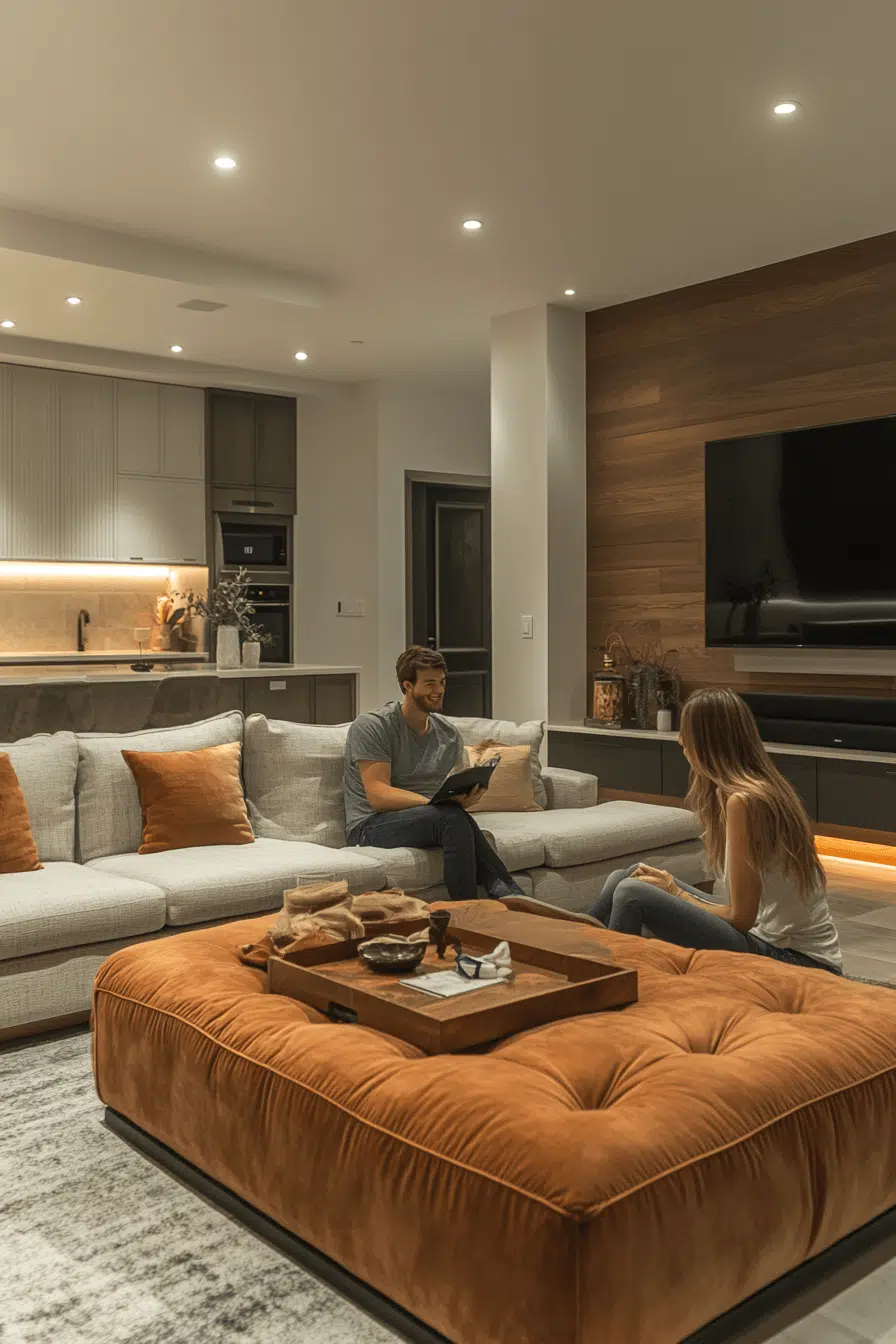 Bring innovation downstairs with basement family room ideas centered around smart technology. Built-in charging stations, intelligent lighting, and modern media systems keep everything organized. Neutral tones help technology blend naturally into a warm environment. The space feels efficient while still welcoming and comfortable. These basement family room ideas are ideal for families who enjoy modern convenience. Explore more forward-thinking basement family room ideas and modernize your basement today.