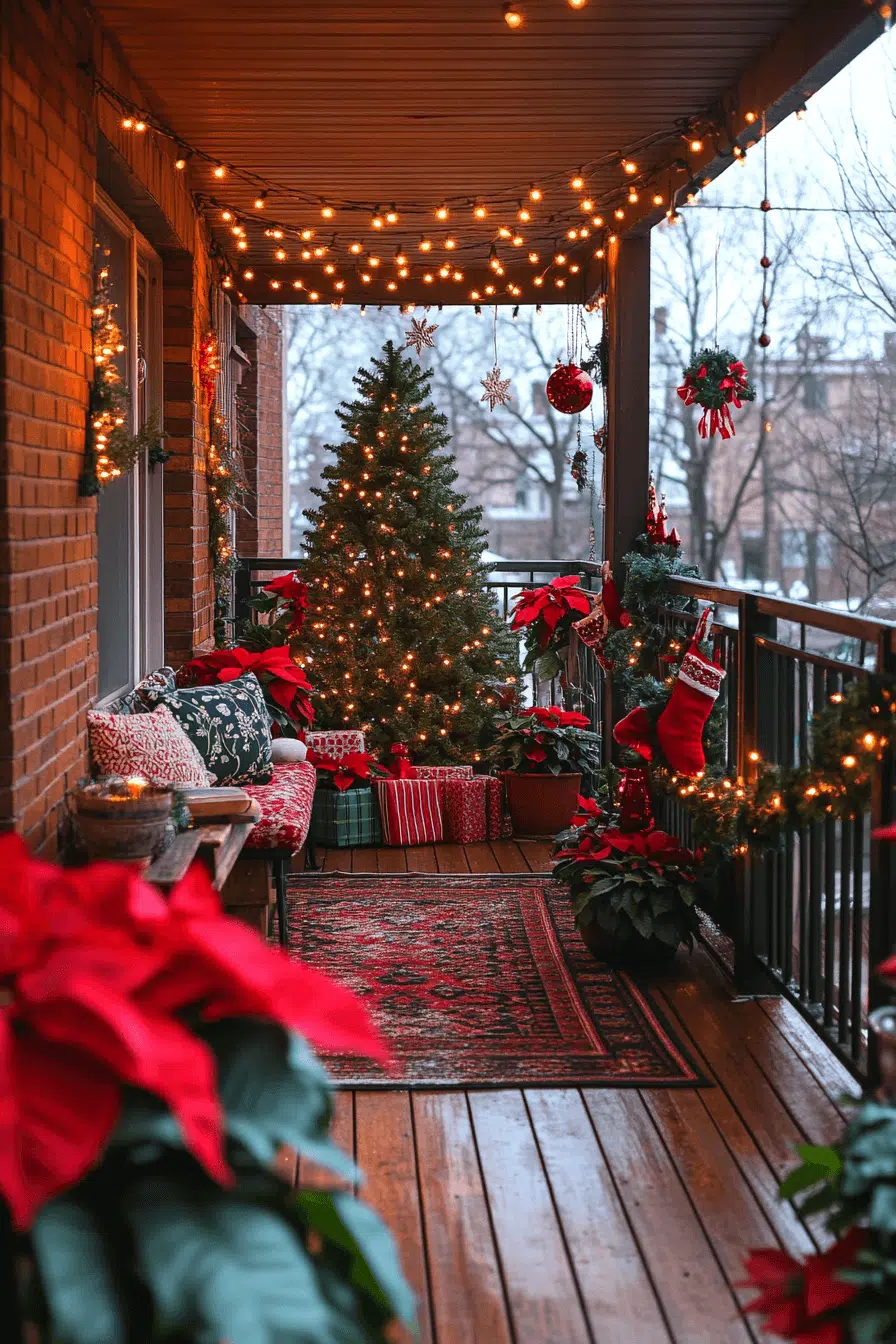 Outdoor magic brightens your balcony with a joyful christmas aesthetic full of lights and seasonal charm. Potted poinsettias, festive garlands, and twinkling bulbs transform even small spaces into holiday havens. A petite tree adds just the right festive punch. This cheerful nook is perfect for enjoying crisp winter air.