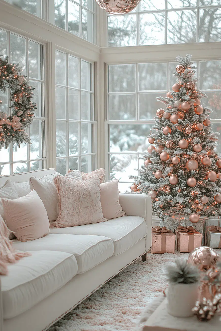 Rose gold glamour sweeps through your sunroom with a soft and modern christmas aesthetic. Blush-toned ornaments and pink tinsel pair beautifully with white accents for a glowing finish. Twinkling lights make the space perfect for relaxing with cocoa. The result feels elegant, cozy, and picture-perfect.