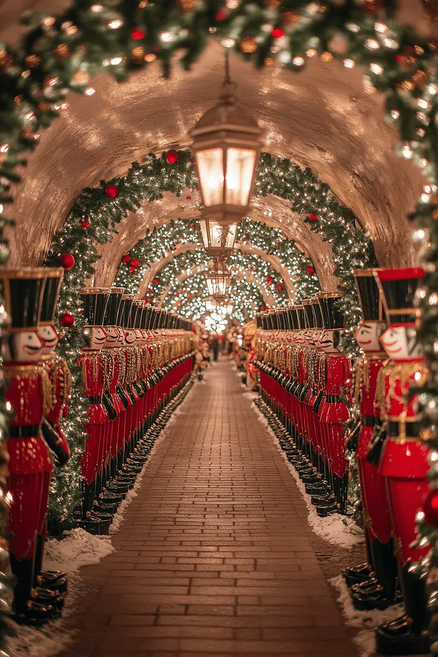 Nutcracker drama unfolds in your hallway with a christmas aesthetic rooted in charming tradition. Tall toy soldiers, red-and-gold decor, and whimsical accents create a magical procession. Vintage touches add storybook flair to the entire space. Every step becomes part of a festive journey.