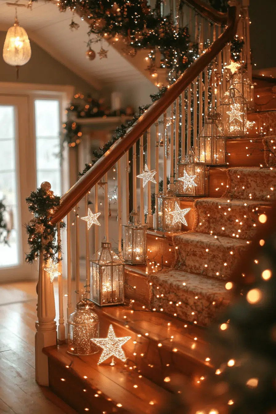 Starlit beauty cascades down your staircase with a celestial christmas aesthetic full of shimmer. Glowing lanterns, metallic tones, and star ornaments create an enchanting pathway. Soft lighting adds warmth that balances the sparkle. Guests feel transported into a magical holiday world.