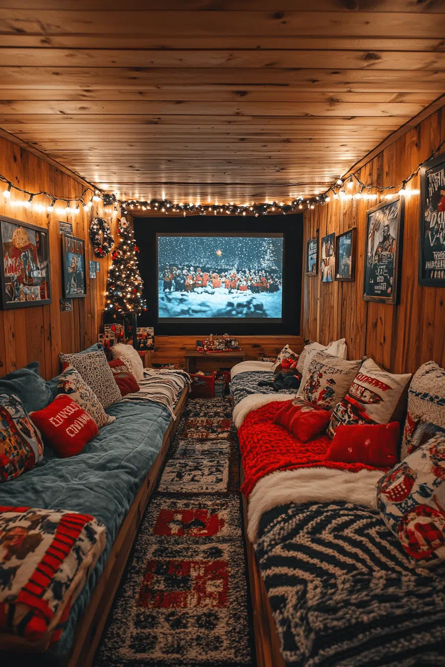 Holiday coziness transforms your basement into the ultimate seasonal retreat with a comforting christmas aesthetic. Twinkling lights and oversized blankets create a warm atmosphere made for movie nights. Vintage Christmas posters bring nostalgic charm to the walls. A hot cocoa station completes the festive experience.