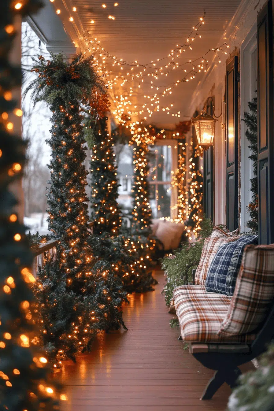 Enchanted forest charm breathes life into your porch through a whimsical christmas aesthetic. Lit trees, rustic garlands, and woodland creatures create a magical outdoor entrance. Fairy lights add soft warmth that enchants every visitor. The look blends rustic beauty with storybook fantasy.