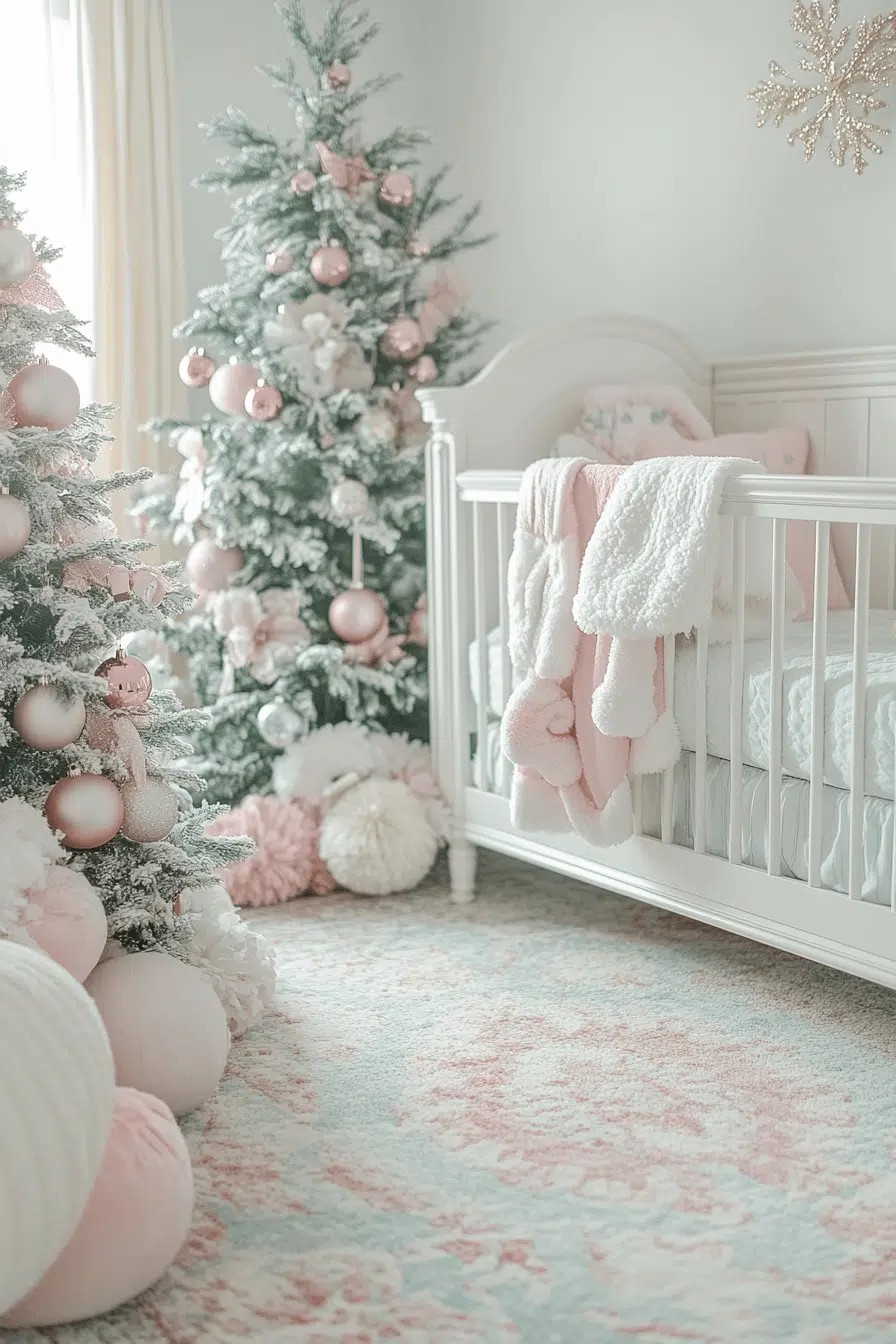 Pastel sweetness softens your nursery with a gentle christmas aesthetic ideal for baby’s first holiday. Mint greens, pale pinks, and fluffy textures create a soothing seasonal palette. Mini trees and sparkling details add playful charm without overwhelming the space. Everything feels safe, warm, and dreamy.