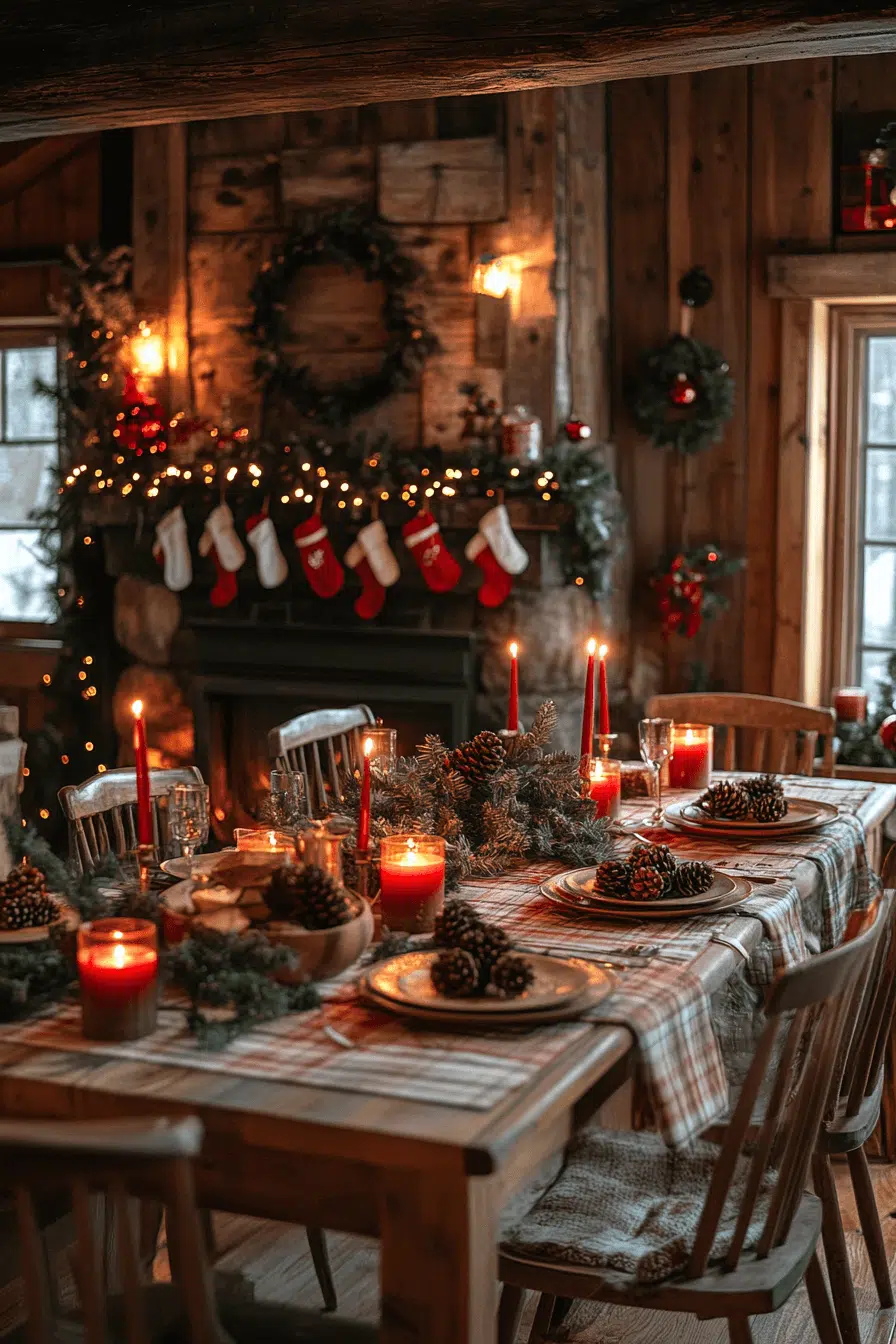 Rustic kitchen charm comes alive through a christmas aesthetic built on warm woods and mountain-lodge textures. Plaid accents, pine garlands, and berry-dusted wreaths add comforting holiday depth. Copper cookware brings a festive gleam that feels both nostalgic and inviting. Every detail blends function with heartfelt seasonal style.