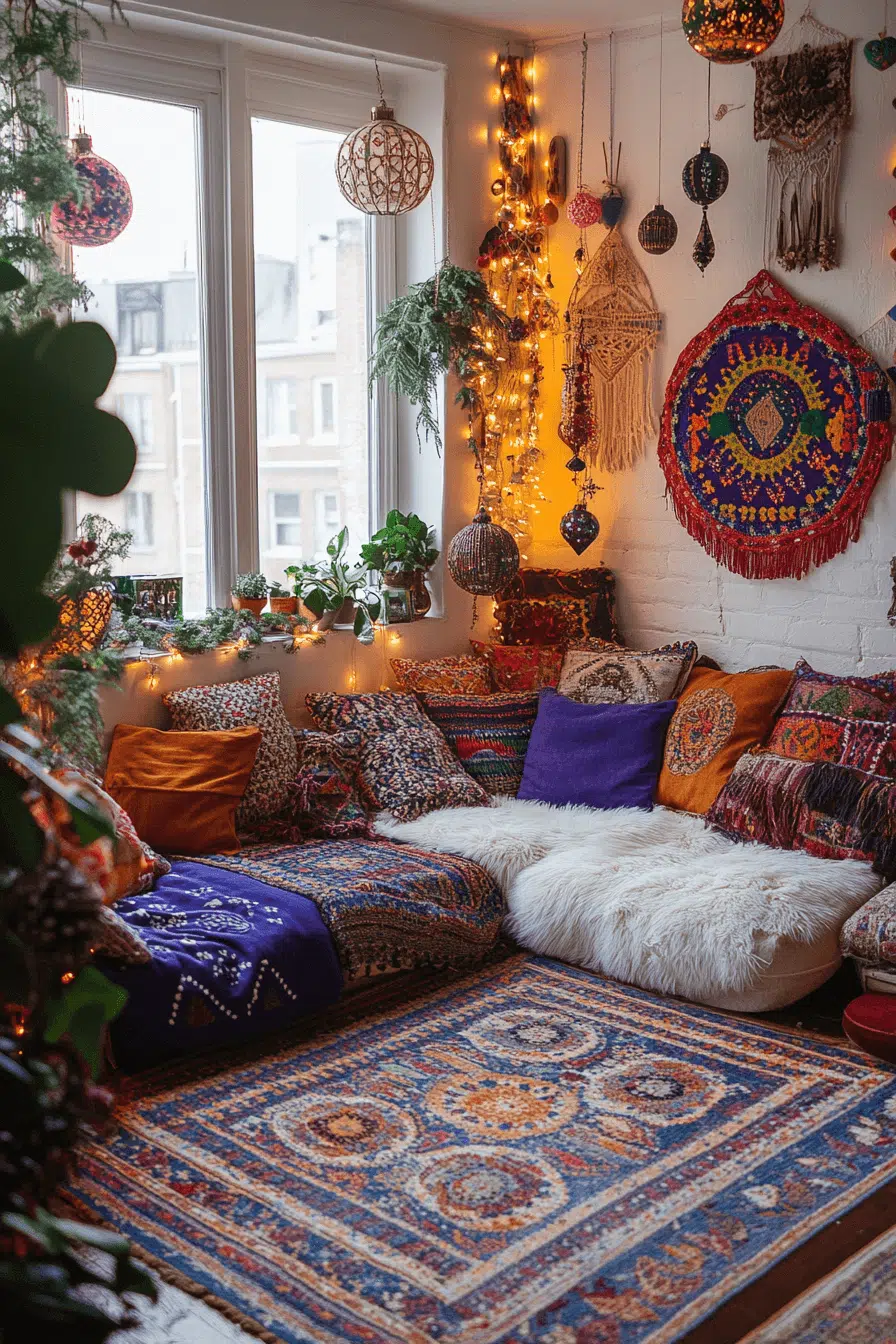 Boho flair brings artistic charm to your living area with a christmas aesthetic full of soulful personality. Beaded garlands, textured pillows, and handmade ornaments add layers of creativity. Global-inspired decor mixes effortlessly with warm lighting. The entire space feels joyful, relaxed, and beautifully eclectic.