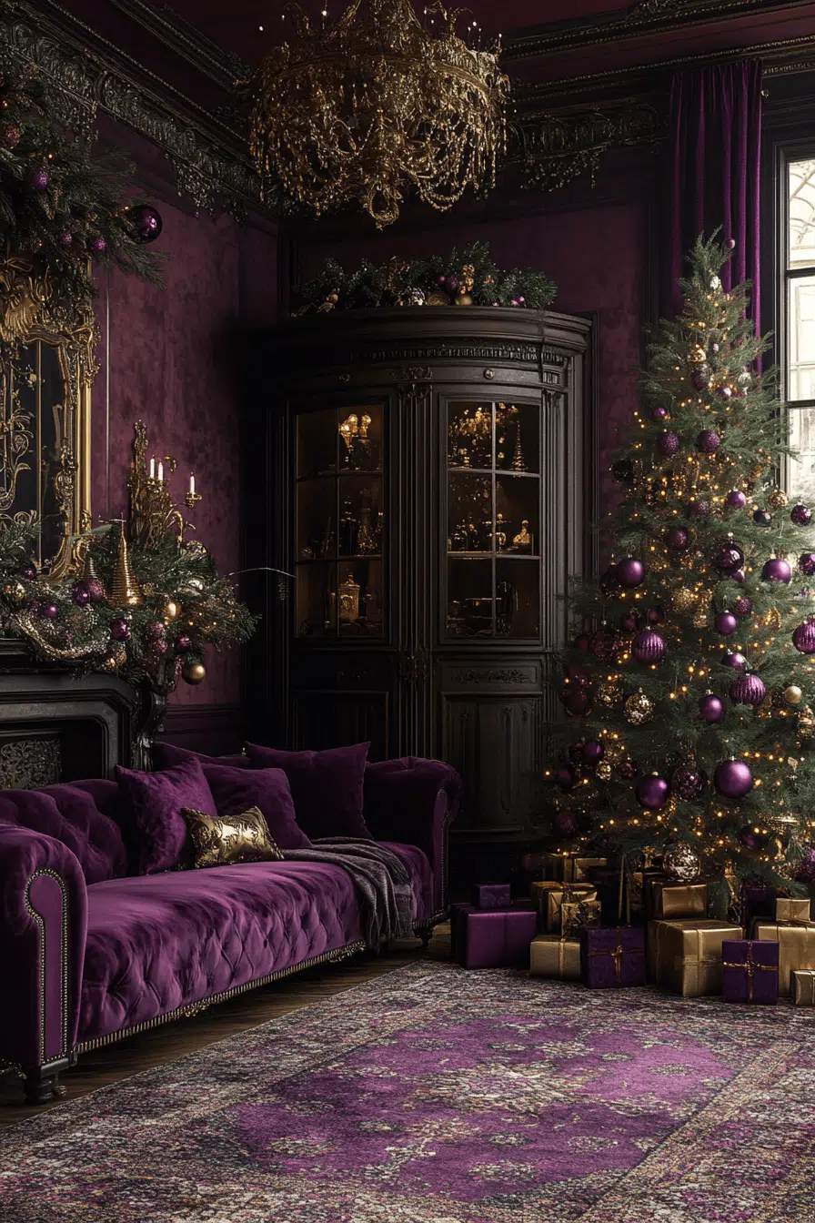 Plum and gold richness brings regal drama to your drawing room with a luxurious christmas aesthetic. Deep purples paired with shimmering gold tones elevate the entire atmosphere. Velvet textures and ornate accents complete the glamorous look. The space feels warm, moody, and sophisticated.