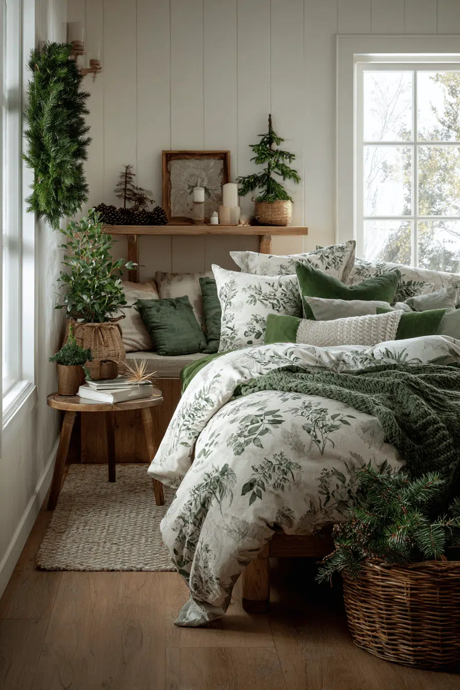 Earthy warmth welcomes guests into a serene retreat shaped by a nature-inspired christmas aesthetic. Leafy garlands, wooden accents, and soft linens provide grounded tranquility. Seasonal greenery adds life without overwhelming the room. Visitors instantly feel comforted by the calming palette.