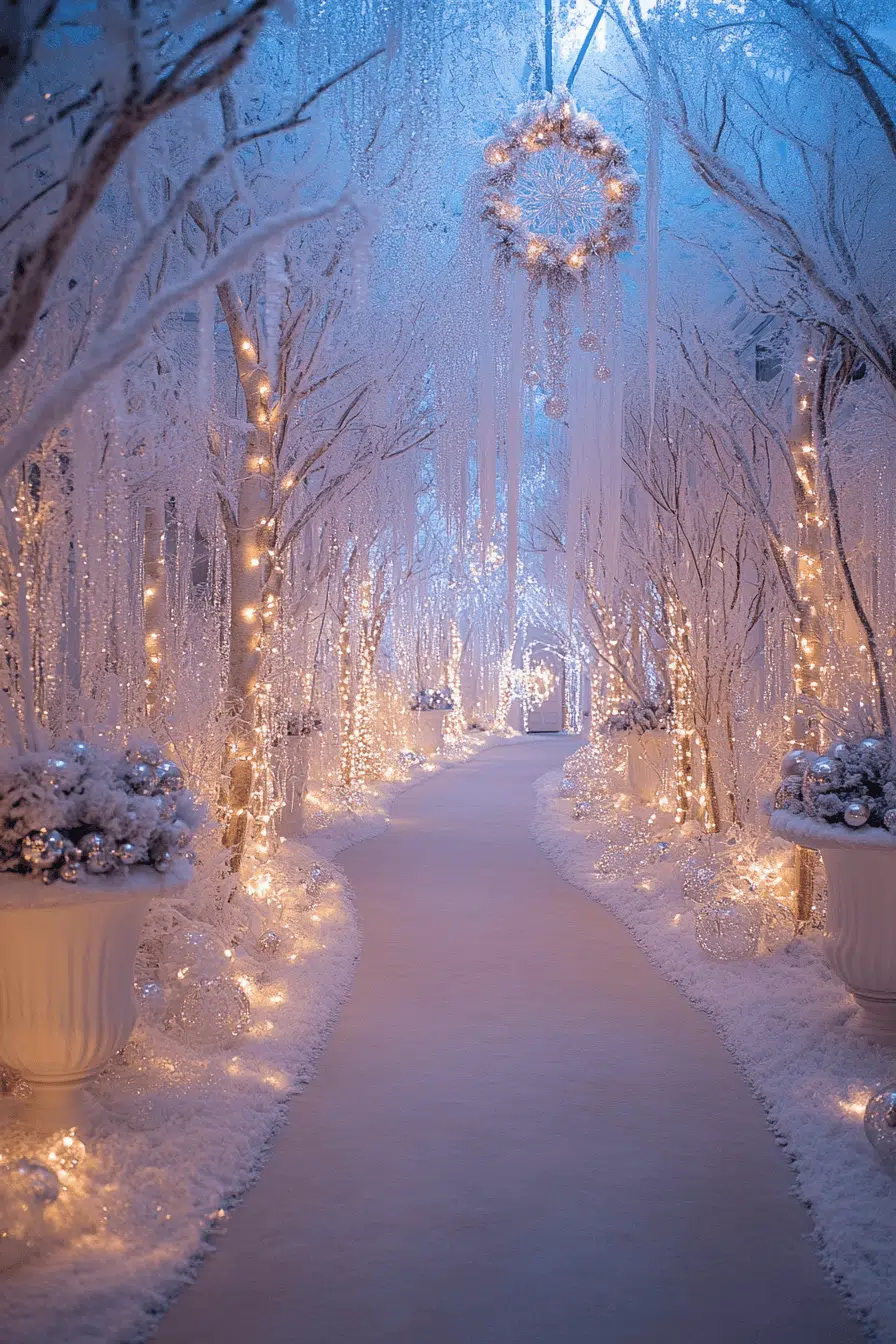 Frosted forest beauty transforms your entryway into a breathtaking display of winter magic. Crystal icicles, tall branches, and soft lights create an enchanting christmas aesthetic that feels otherworldly. Faux fur textures and silver ornaments enhance the dreamy woodland energy. Guests are immediately greeted with wonder and warmth.
