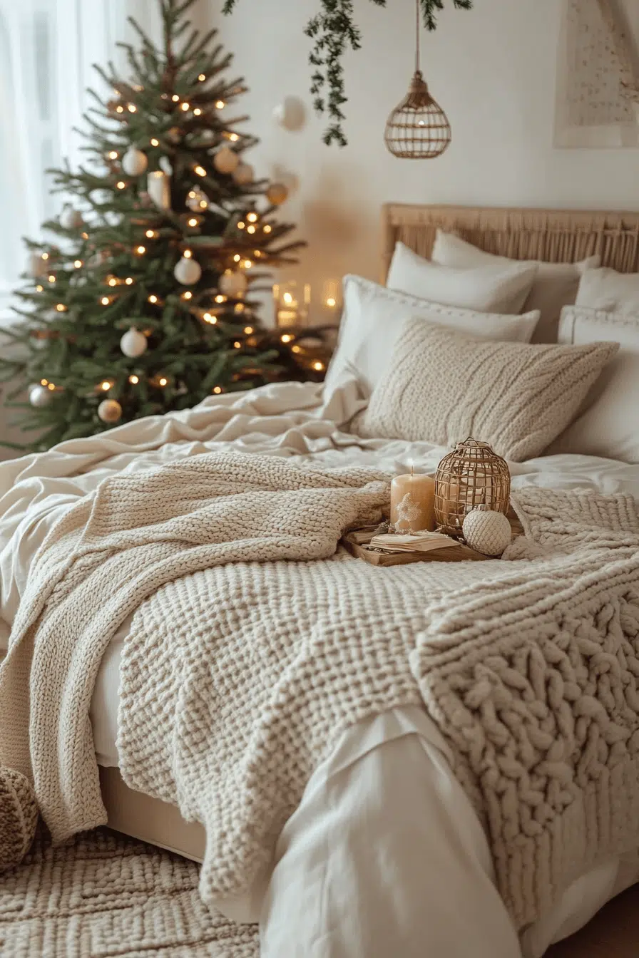 Coastal comfort transforms your bedroom with a breezy christmas aesthetic that blends beach charm with seasonal joy. Seashell garlands, sandy neutrals, and ocean-blue accents set a calm holiday mood. Driftwood trees and starfish touches elevate the seaside ambiance. The result feels refreshing and festive. .