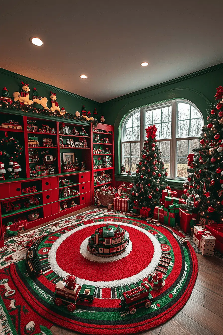Santa’s workshop magic brings playful charm to your playroom through a colorful christmas aesthetic. Bright reds, cheerful greens, and elf-themed accents ignite creativity and excitement. Holiday trains, whimsical bins, and vibrant décor energize the entire room. Kids feel immersed in pure holiday fun from every corner.
