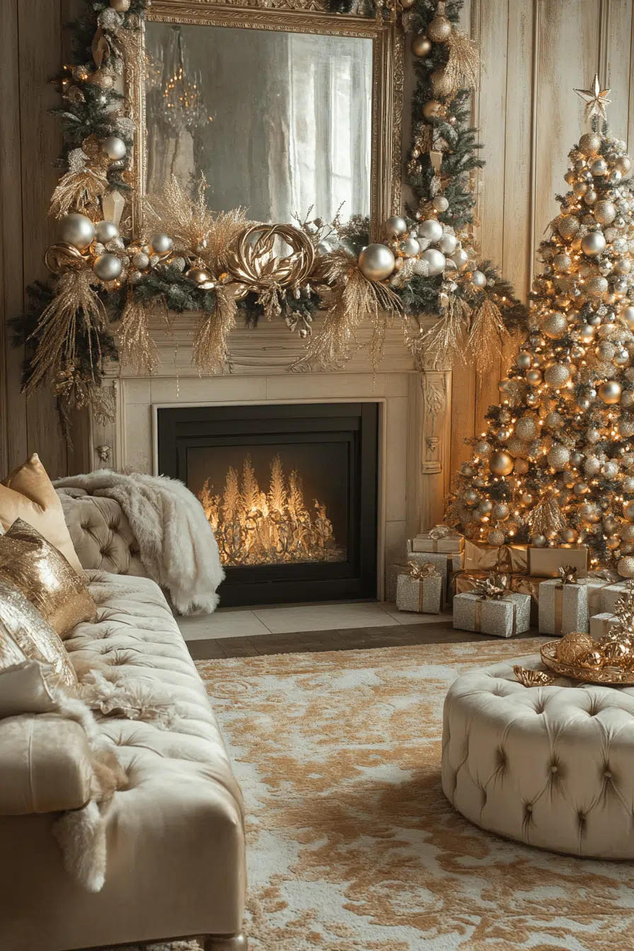 Glamorous shine illuminates your lounge with a christmas aesthetic built on metallic gold and silver sparkle. Sequins, reflective surfaces, and mirrored ornaments bounce holiday light in every direction. Elegant textures add richness to the already luxurious look. The room transforms into a festive gathering space full of brilliance.