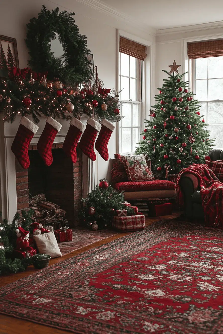 Timeless red-and-green cheer fills your family room with a christmas aesthetic overflowing with nostalgic comfort. Plaid throws, classic ornaments, and vintage-inspired décor set the stage for heartfelt traditions. A glowing fire enhances the cozy scene perfectly. The entire room feels like a warm holiday embrace.