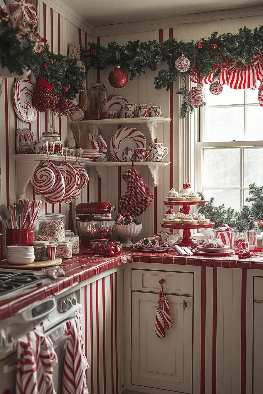 Candy-striped cheer energizes your kitchen with a peppermint-inspired christmas aesthetic. Red-and-white patterns on towels, utensils, and décor pieces give the room an upbeat feel. Baking days become even more joyful with this playful palette. The look is sweet, simple, and festive from every angle.