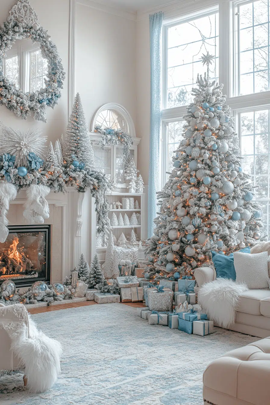 Snowy elegance fills this living room with a christmas aesthetic that sparkles in icy blue and silver. Fluffy textures and frost-touched details create a peaceful, wintry escape. Lanterns cast a soft glow while snowy window decals add a magical fairytale effect. Cozy layers invite you to settle in and savor the season’s calm.