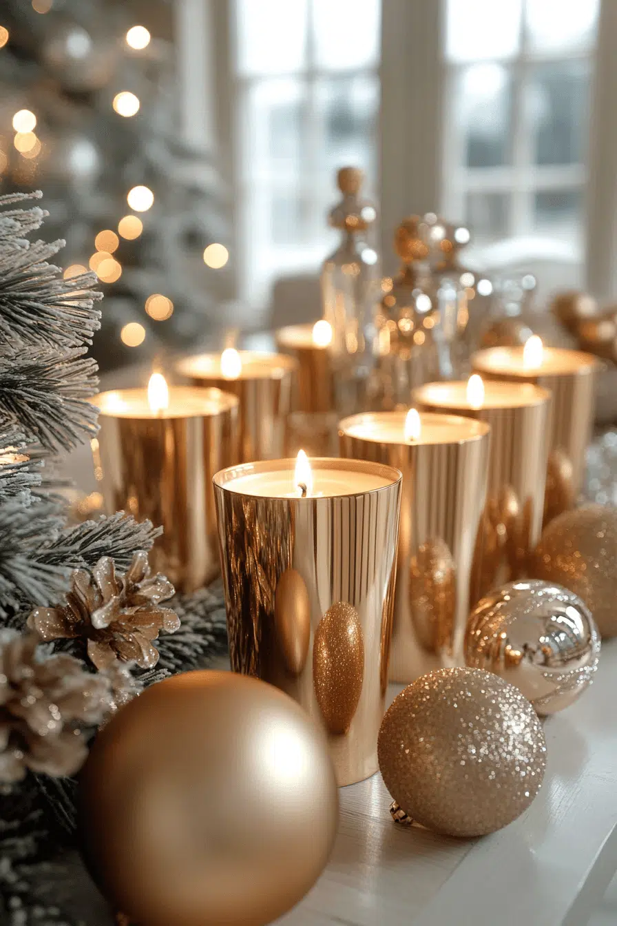 Golden candles bring a warm, luminous radiance that instantly enriches your holiday decor. Their metallic tones shine even brighter beside greenery or deep jewel colors. These christmas candle decor ideas deliver elegance without losing that cozy seasonal feel. They’re perfect for sophisticated tablescapes and intimate gatherings alike.