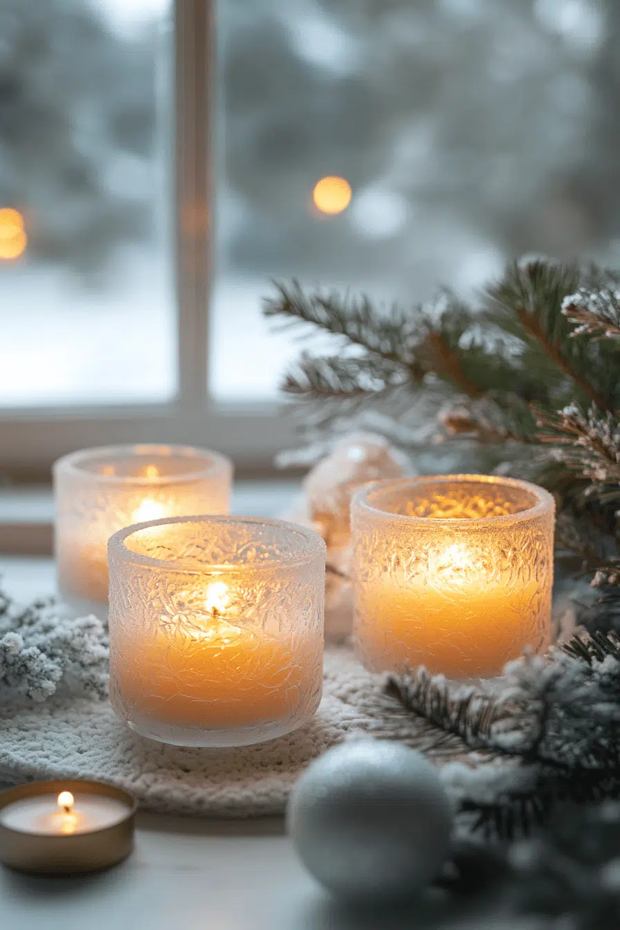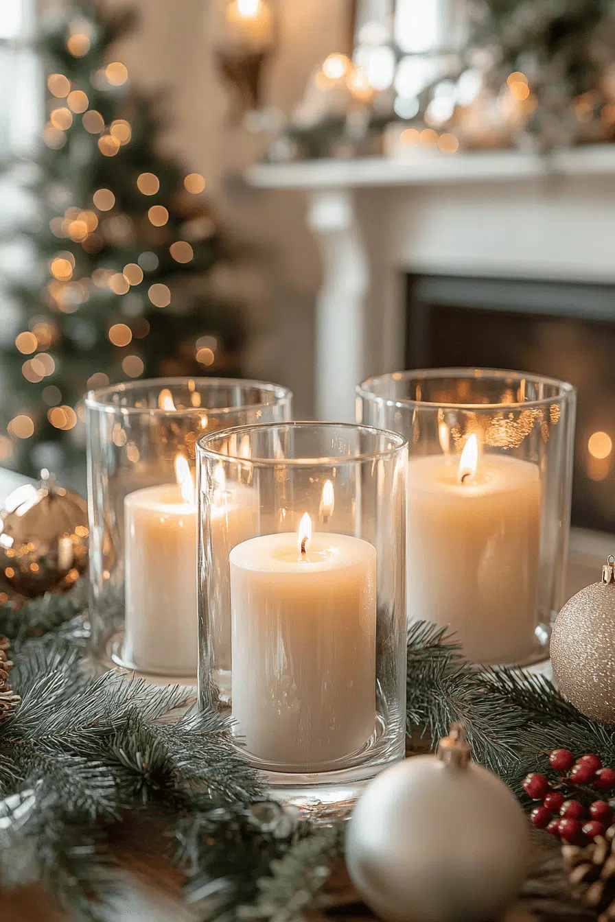 Frosted candle holders cast a soft, icy light that feels peaceful and beautifully wintery. Their misty finish adds a luxurious, snowy effect to any display. These christmas candle decor ideas enhance mantels, windowsills, and dining tables with subtle elegance. They look stunning in both minimal and classic themes.