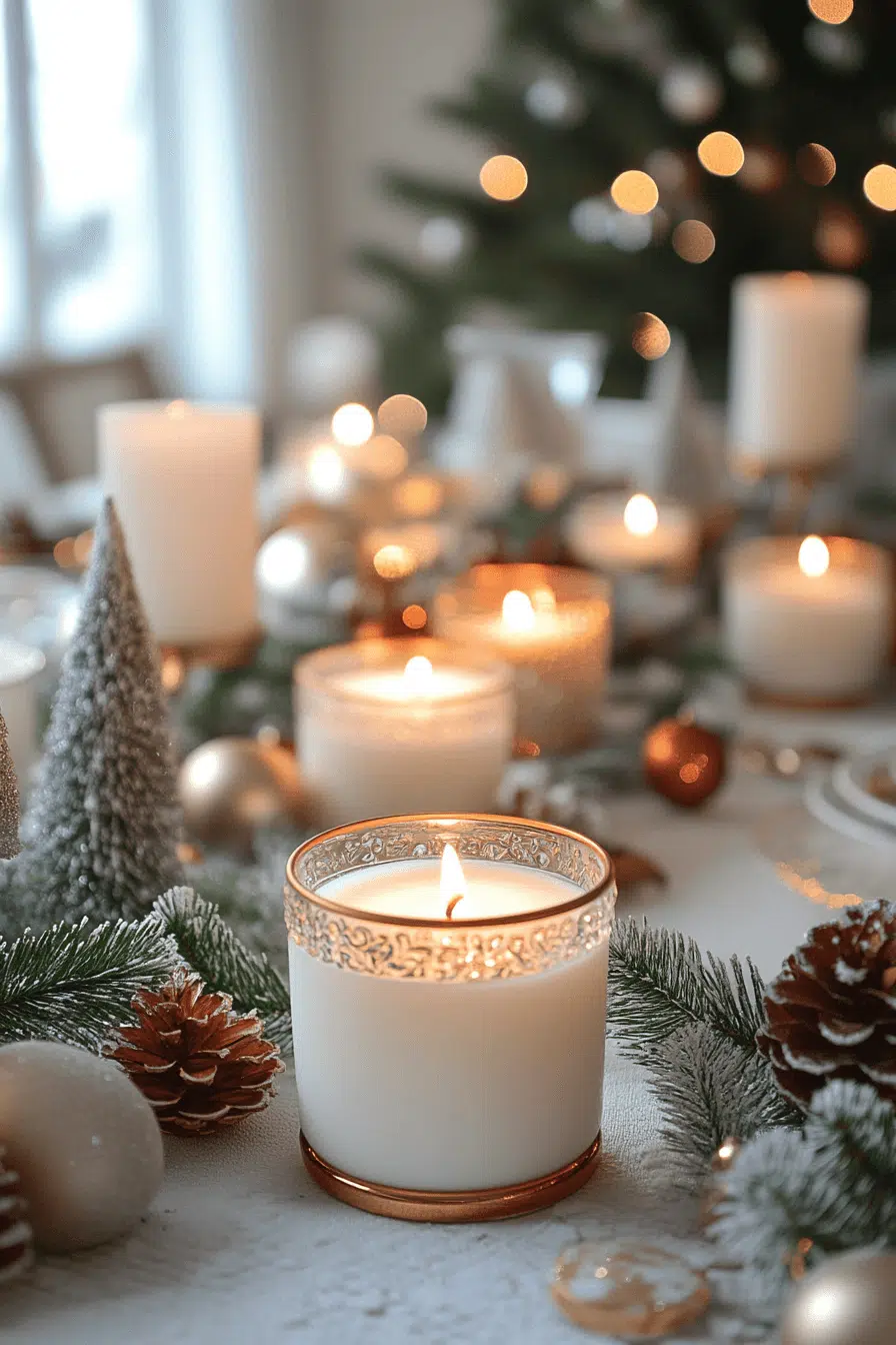 Glittering candle jars transform any surface into a dazzling holiday display that sparkles from every angle. The reflective textures bounce light around the room for a bold, festive glow. These christmas candle decor ideas are perfect for anyone who loves glamorous seasonal accents. They instantly energize side tables, mantels, or dessert stations.