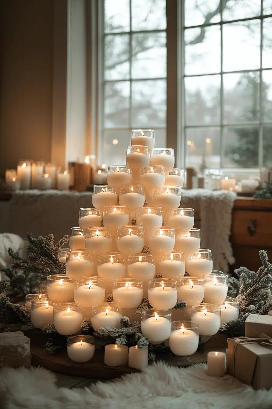 Floating candles inside glass bowls or lanterns add elegance with a soft, reflective glow. The gentle movement creates a calming, storybook effect perfect for peaceful evenings. These christmas candle decor ideas blend vintage charm with a modern twist. They’re stunning as centerpieces or quiet decorative accents.