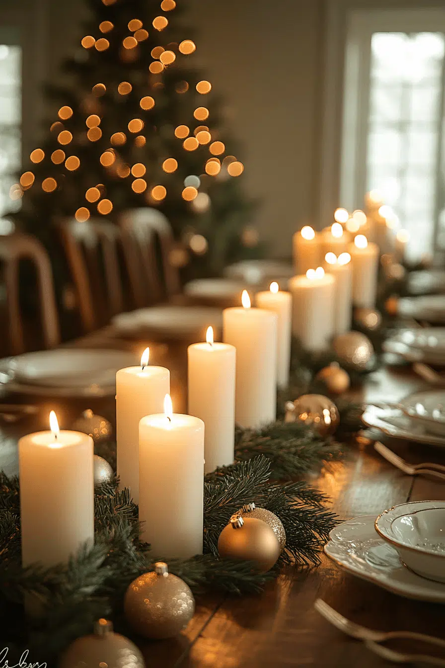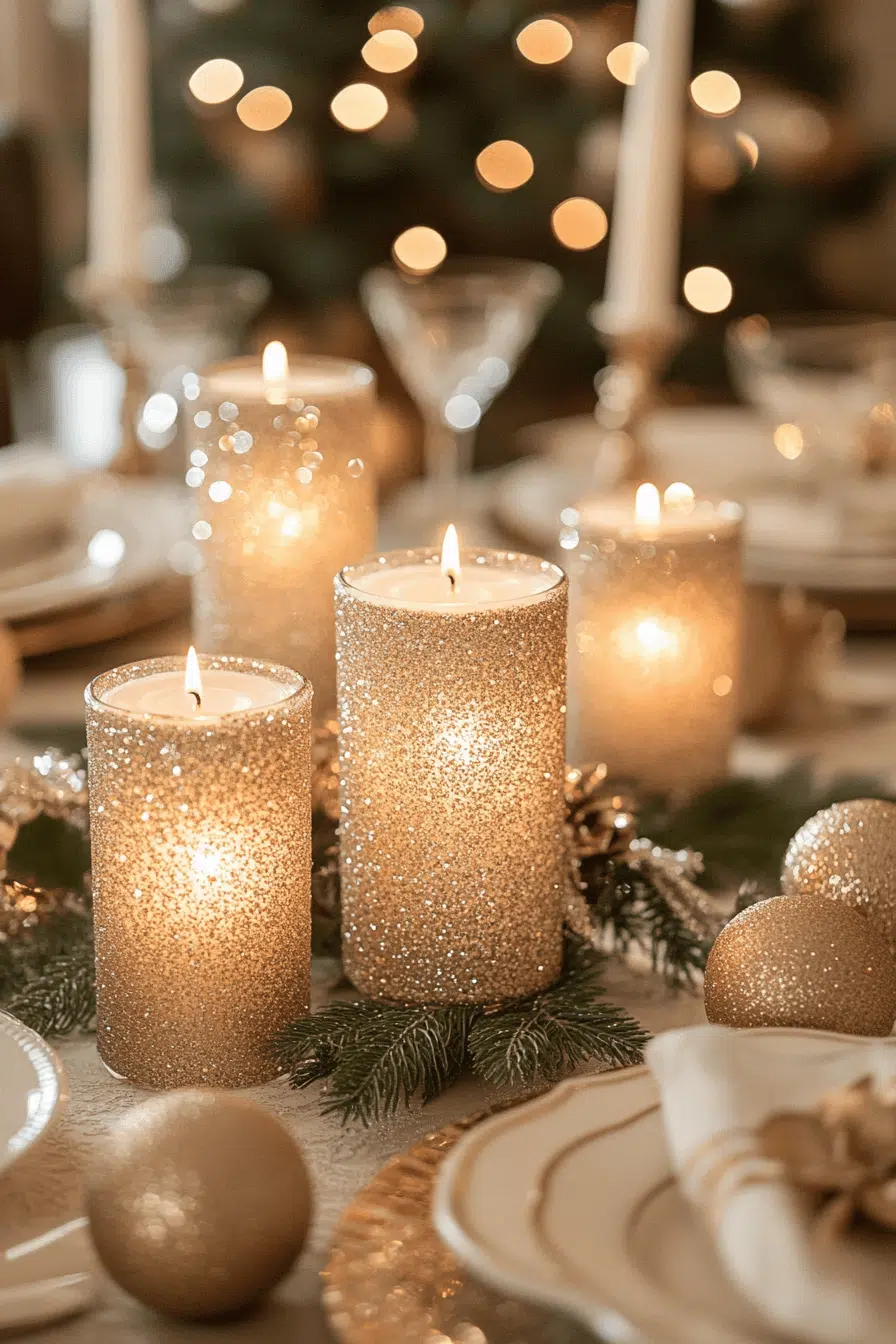 Tables lit with candles transform every meal into a warm, glowing holiday moment. Mixed heights and candle styles add visual richness and atmosphere. These christmas candle decor ideas bring unforgettable warmth to dinners and gatherings. The sparkle pairs beautifully with greenery or ribbon accents.