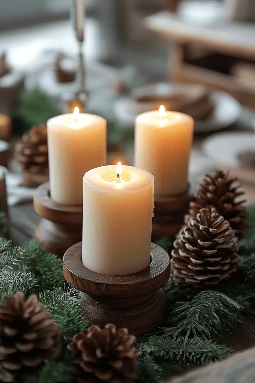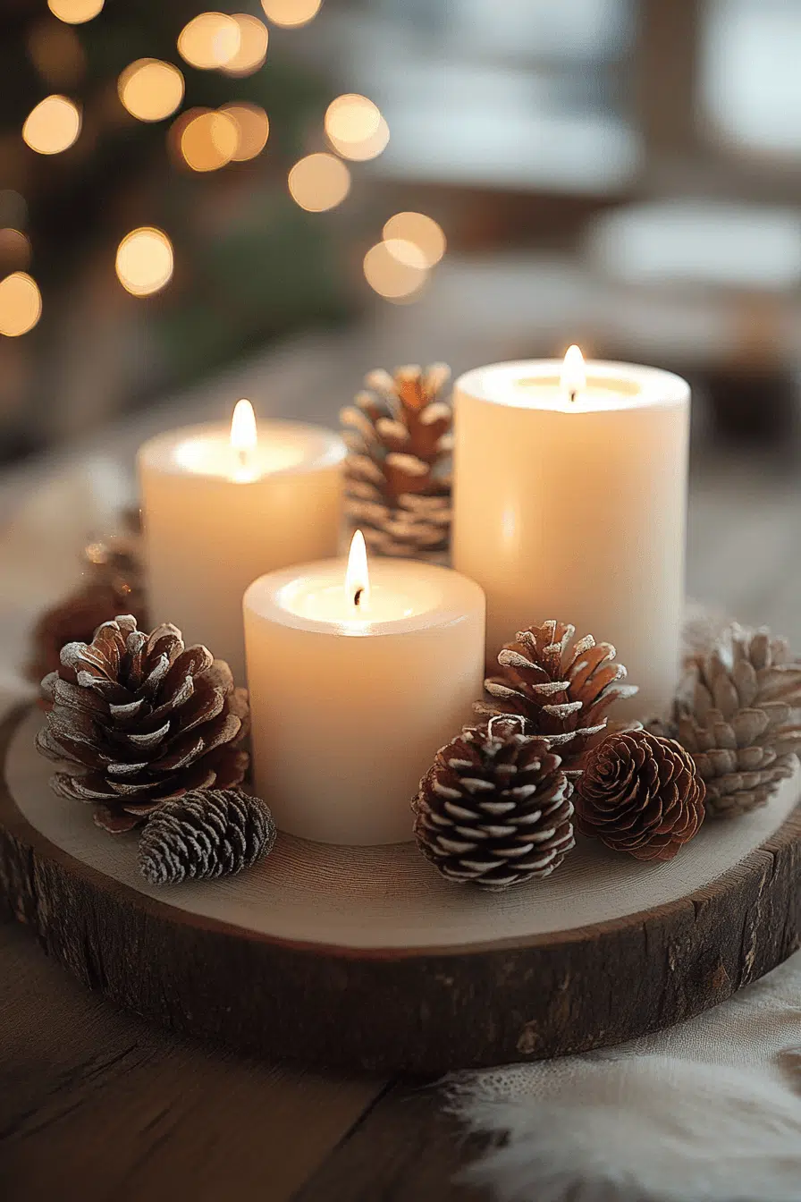 Pinecones arranged with candles build a natural woodland look that feels peaceful and comforting. Each textured detail adds dimension and warmth to the scene. These christmas candle decor ideas channel the spirit of a cozy winter cabin. Wood slices and evergreen touches complete the rustic aesthetic beautifully.