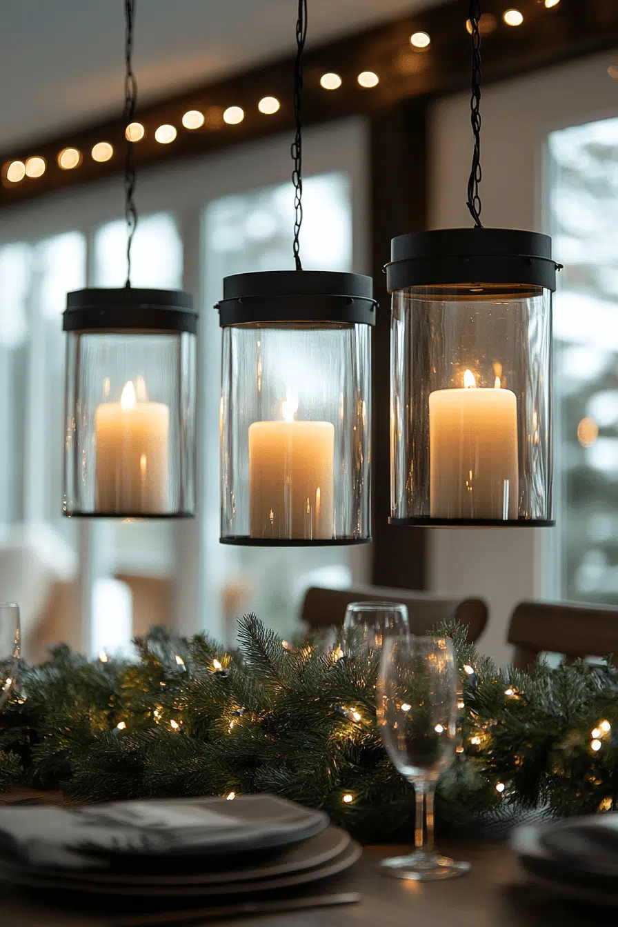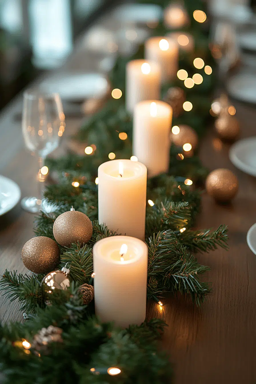Candles paired with garlands create a lush, glowing layered look ideal for mantels or dining tables. The greenery softens the light for a warm, romantic feel. These christmas candle decor ideas blend nature and ambiance in perfect harmony. They’re simple yet striking for any holiday home.