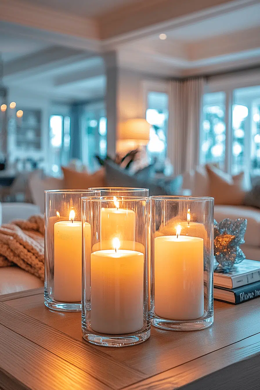 Pillars in clear glass holders provide a clean, modern glow that works in any room. The transparency highlights the beauty of the candle itself. These christmas candle decor ideas offer timeless style that fits minimalist and traditional homes alike. They’re easy to place, easy to pair, and always elegant.