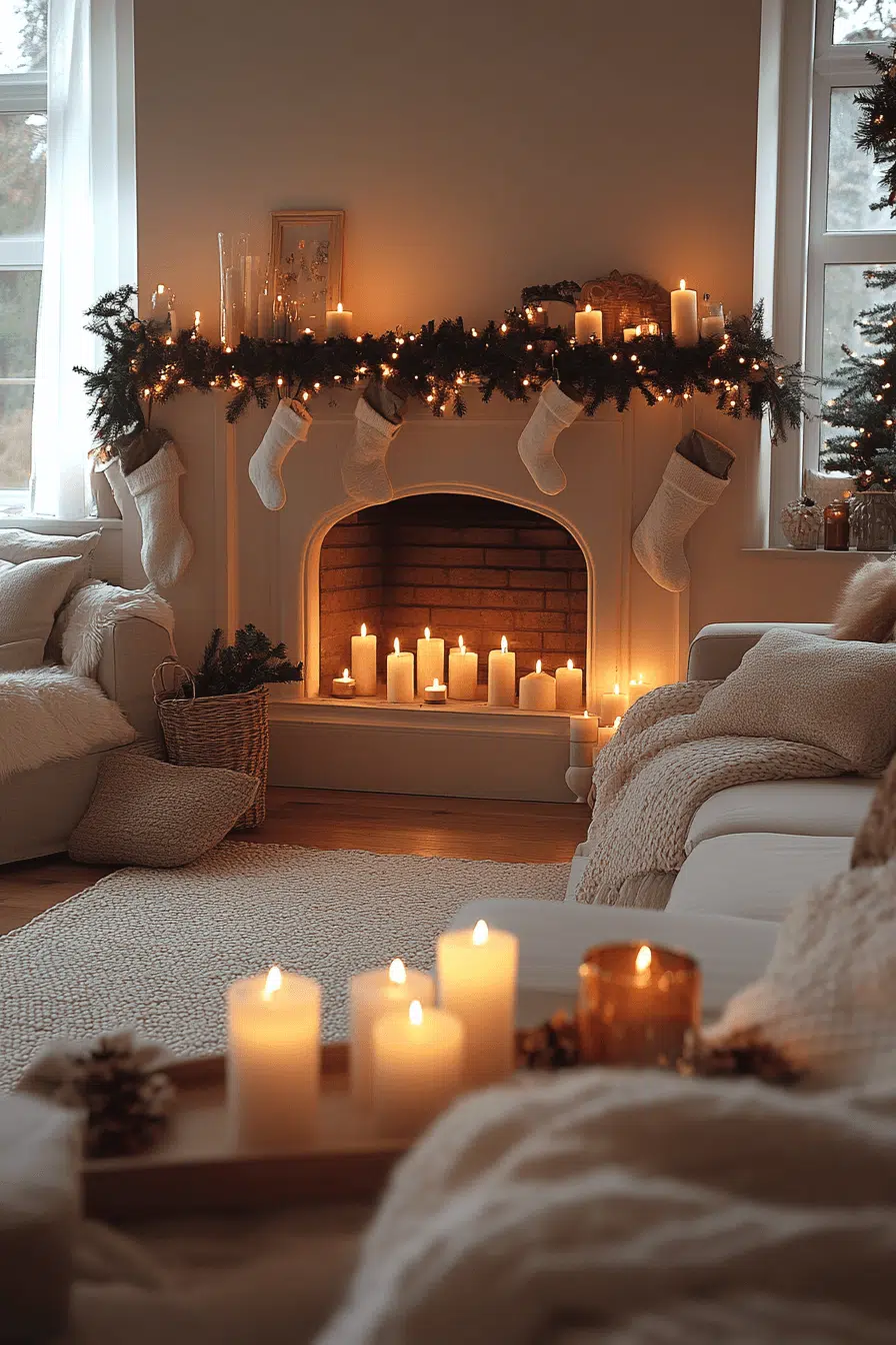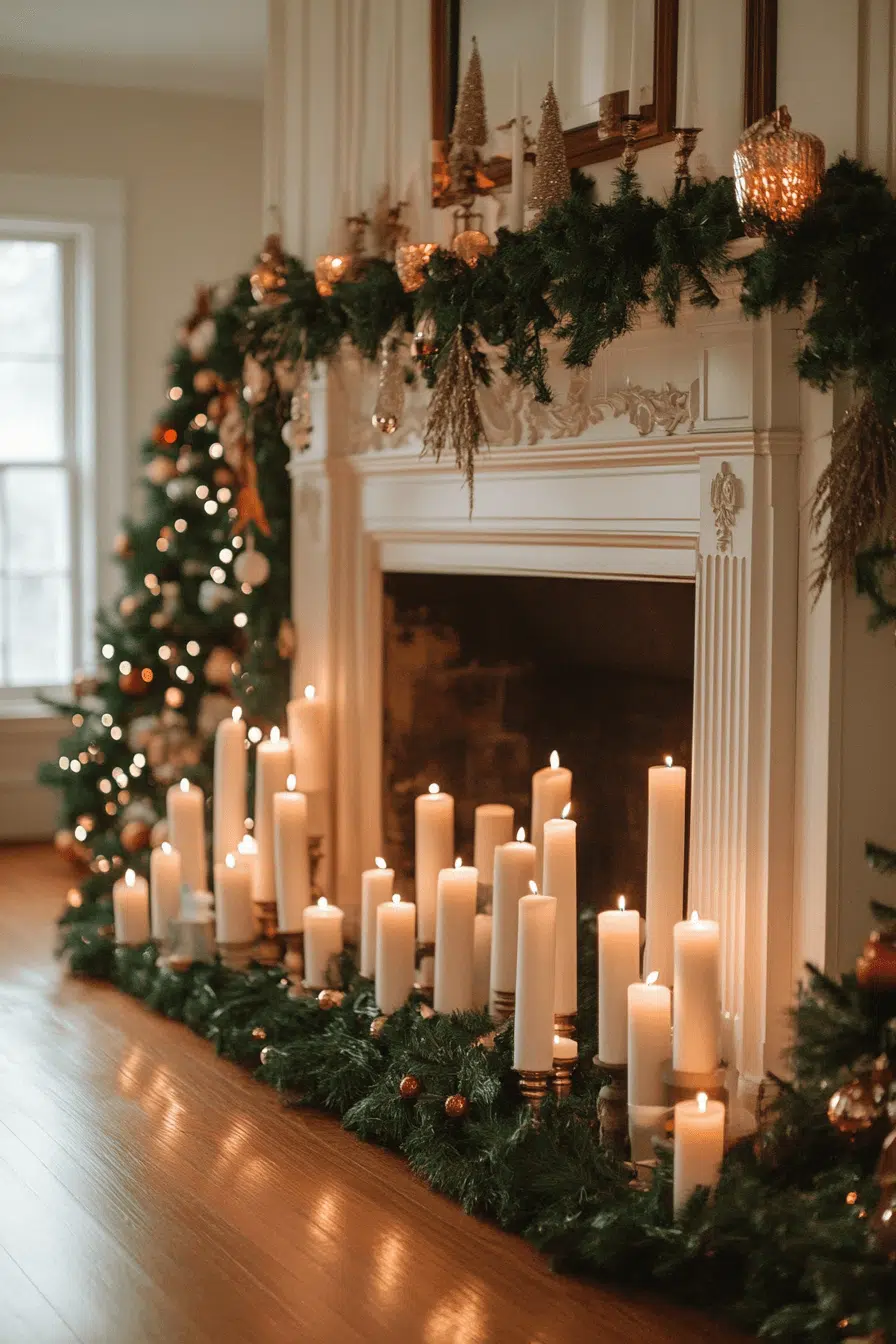 Clusters of candles inside an unused fireplace create a warm, glowing focal point. Different heights and styles make the display feel layered and inviting. These christmas candle decor ideas offer the charm of a fire without the smoke or cleanup. The ambiance is soft, cozy, and perfect for winter nights.