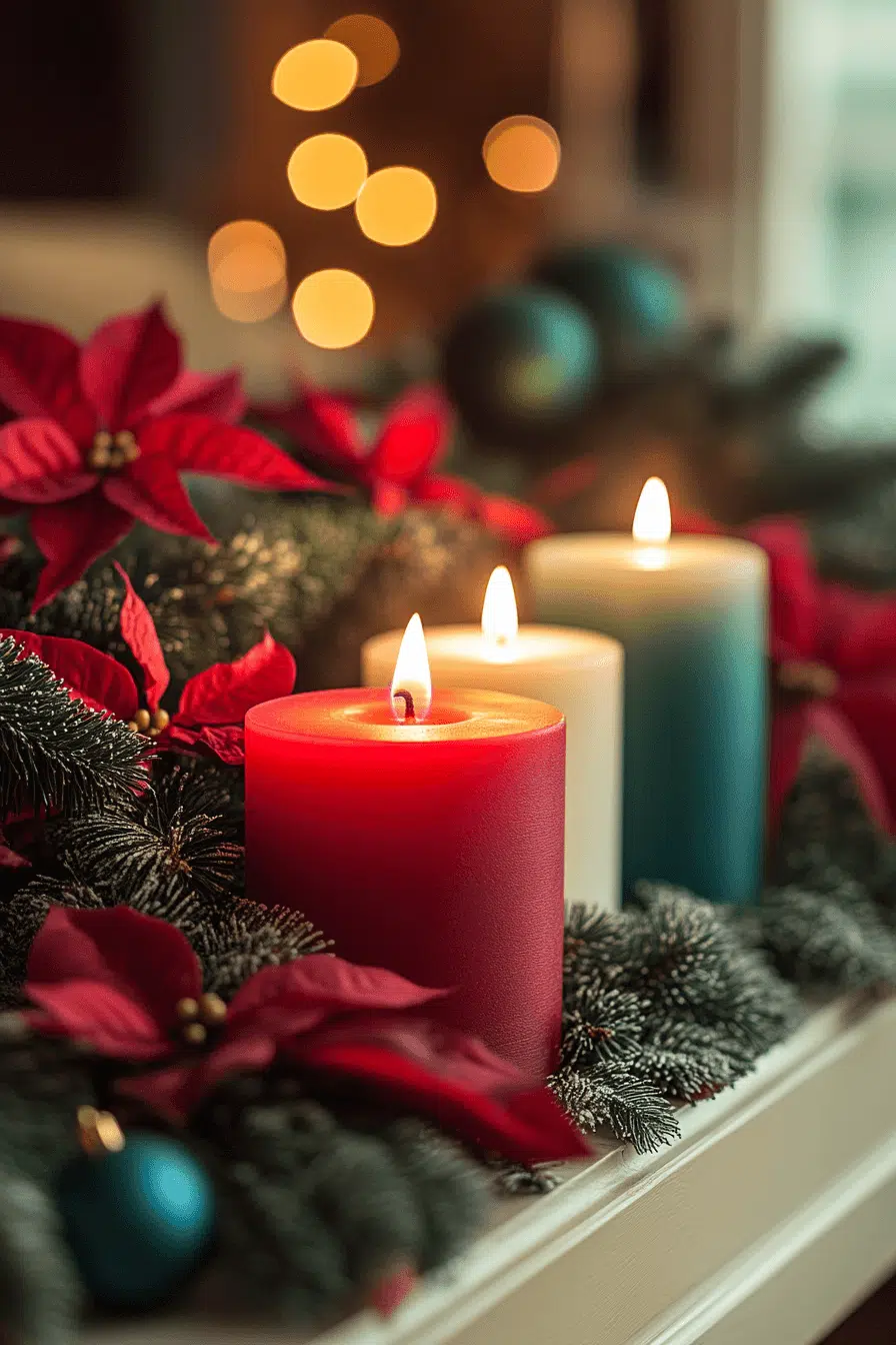 Bright red, green, and white candles fill your home with classic holiday cheer. Their bold colors instantly energize your seasonal setup. These christmas candle decor ideas make playful, festive accents anywhere you place them. Matching ribbons or linens enhance the look even more.