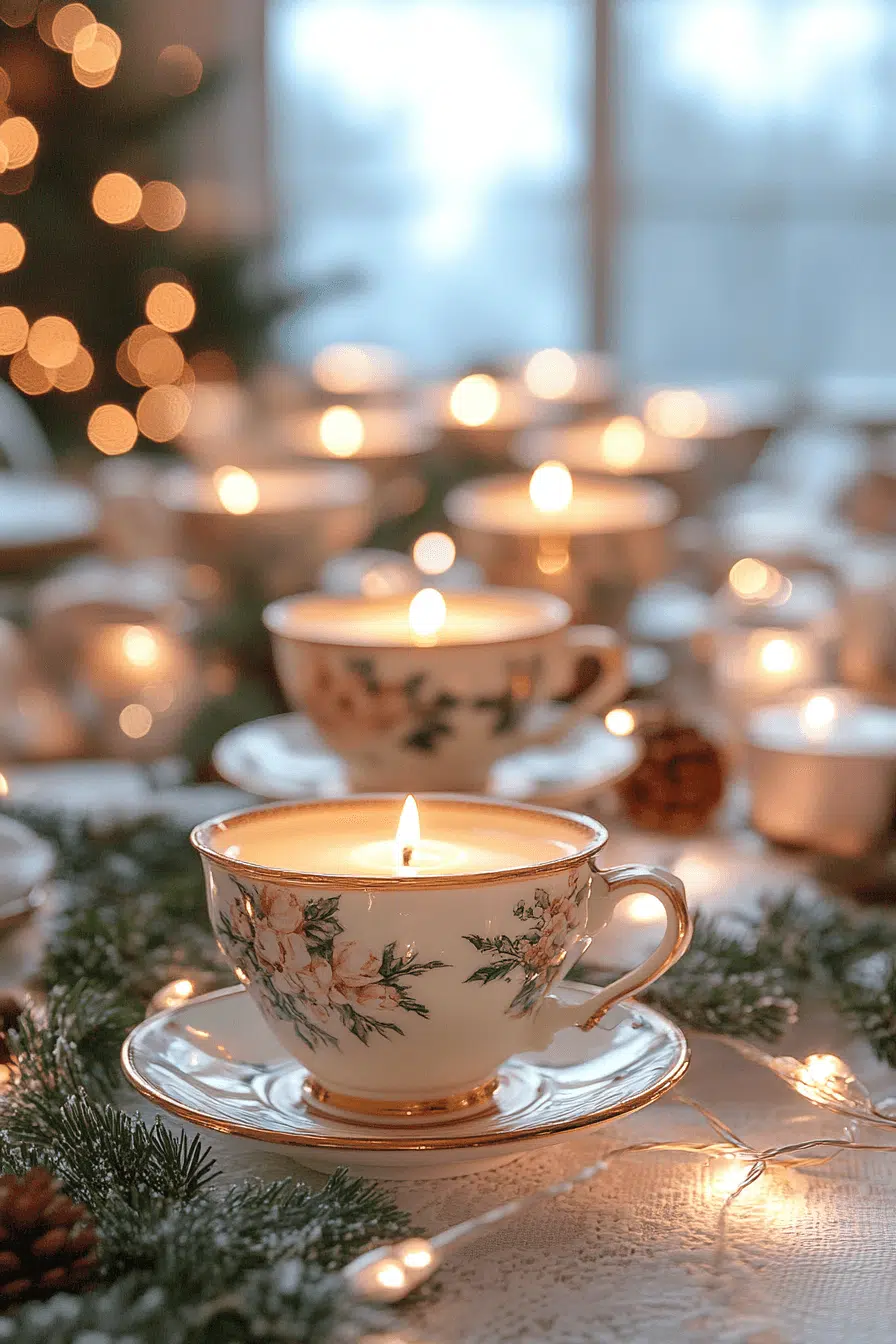 Vintage teacup candles bring old-school charm and storybook elegance to your decor. The delicate details shine beautifully under warm candlelight. These christmas candle decor ideas make thoughtful gifts or nostalgic accent pieces. They blend creativity with tradition effortlessly.