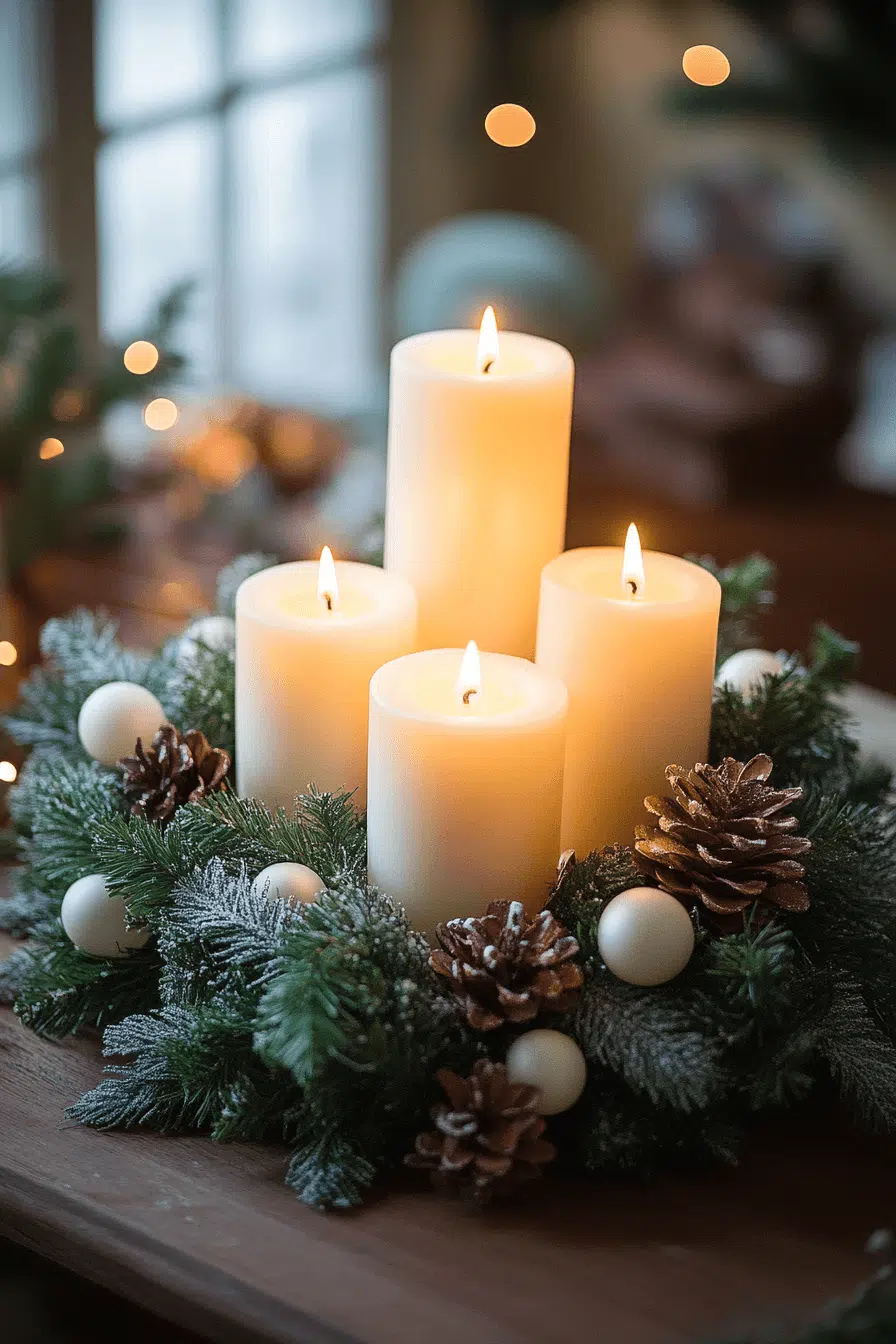 Candles nestled inside seasonal wreaths create a striking combination of greenery and warm light. Each flicker dances through the foliage for a soft, magical effect. These christmas candle decor ideas add sophistication to entryways, dining tables, or mantels. The design feels lush without being overwhelming.