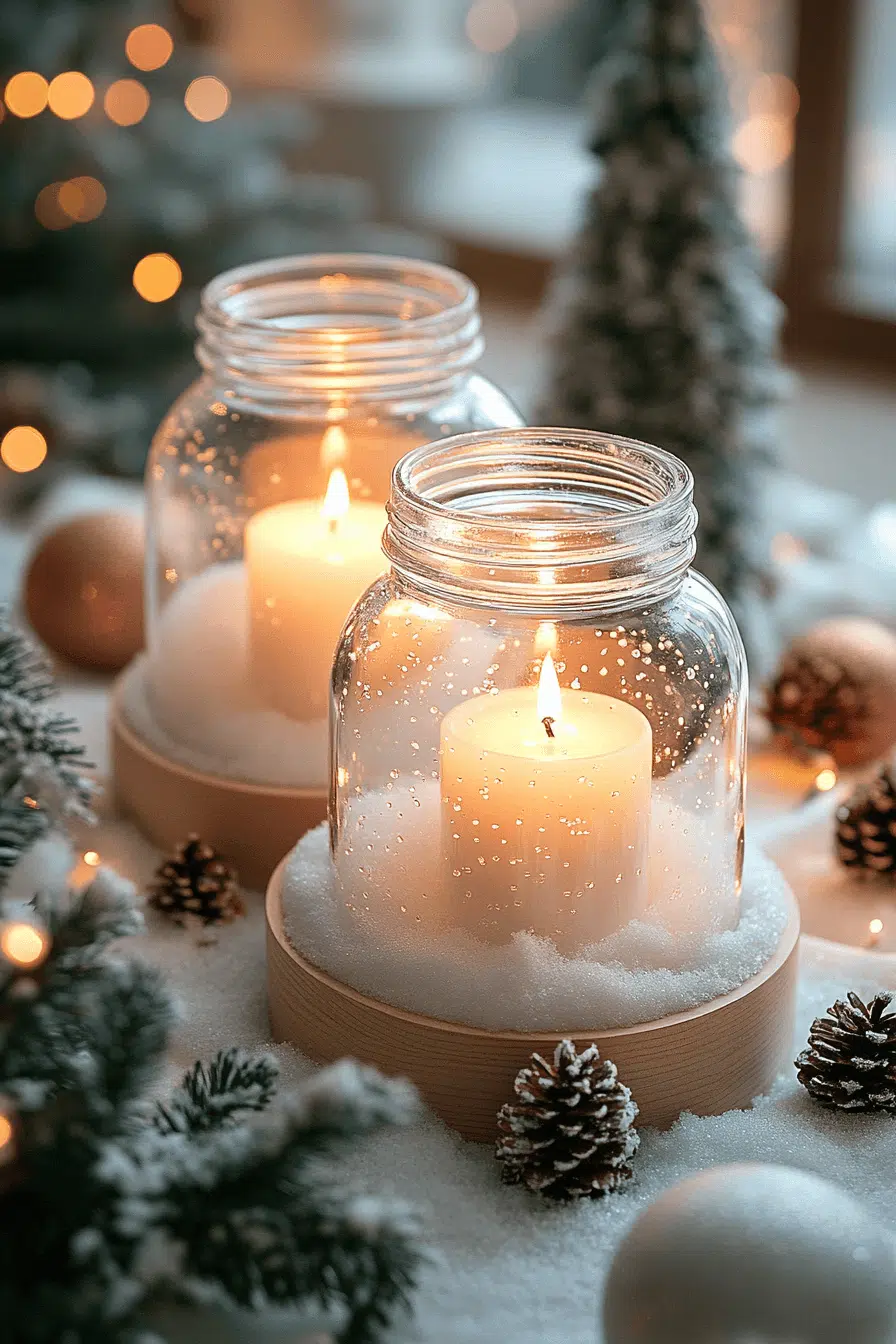 Jar candle holders styled as tiny snow globes add playfulness and winter sparkle to your displays. Faux snow and miniature trinkets glow beautifully when lit from within. These christmas candle decor ideas blend creativity with seasonal charm. They make great centerpieces or family-friendly DIY projects that still look polished.