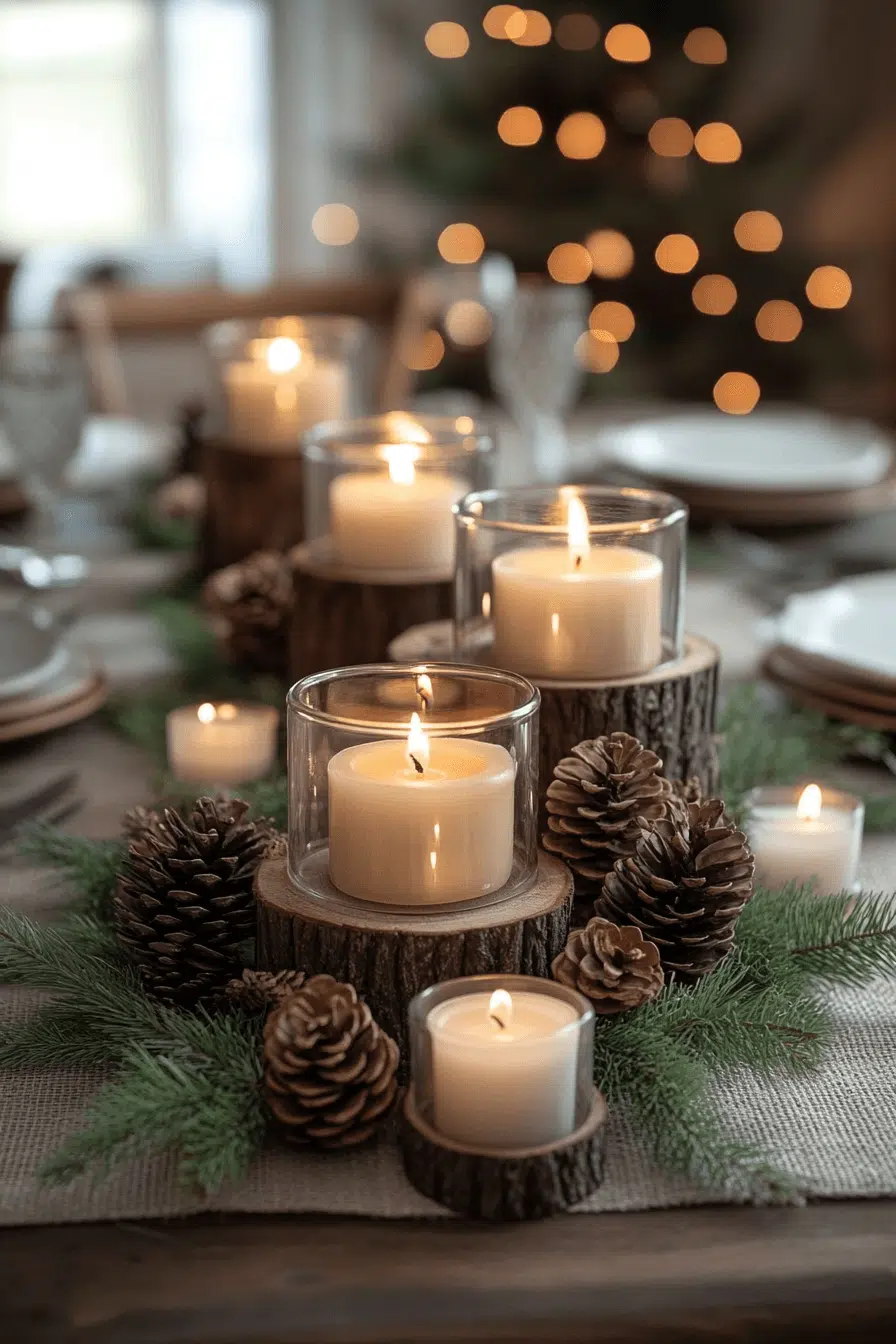 Pinecones arranged with candles build a natural woodland look that feels peaceful and comforting. Each textured detail adds dimension and warmth to the scene. These christmas candle decor ideas channel the spirit of a cozy winter cabin. Wood slices and evergreen touches complete the rustic aesthetic beautifully.