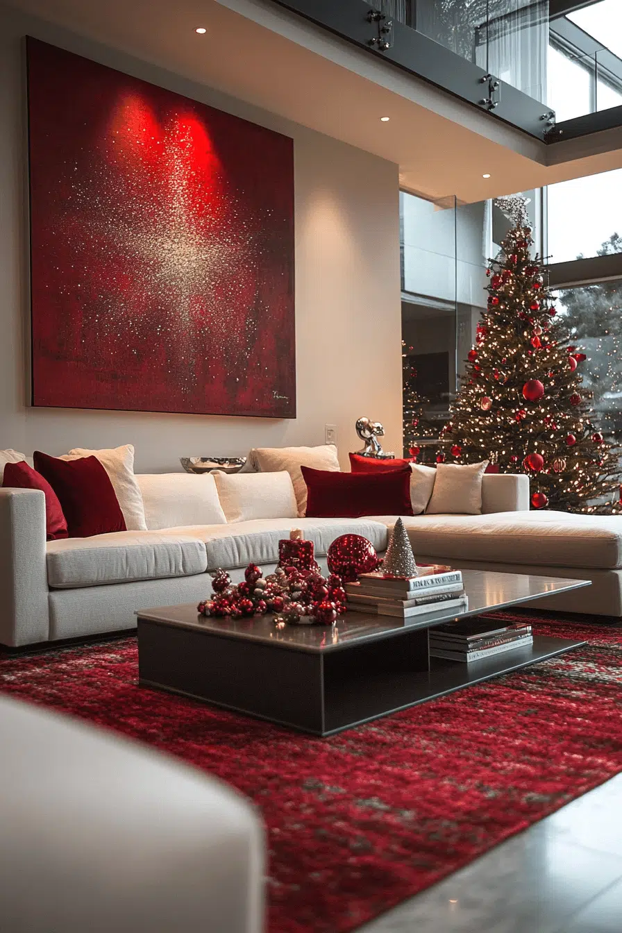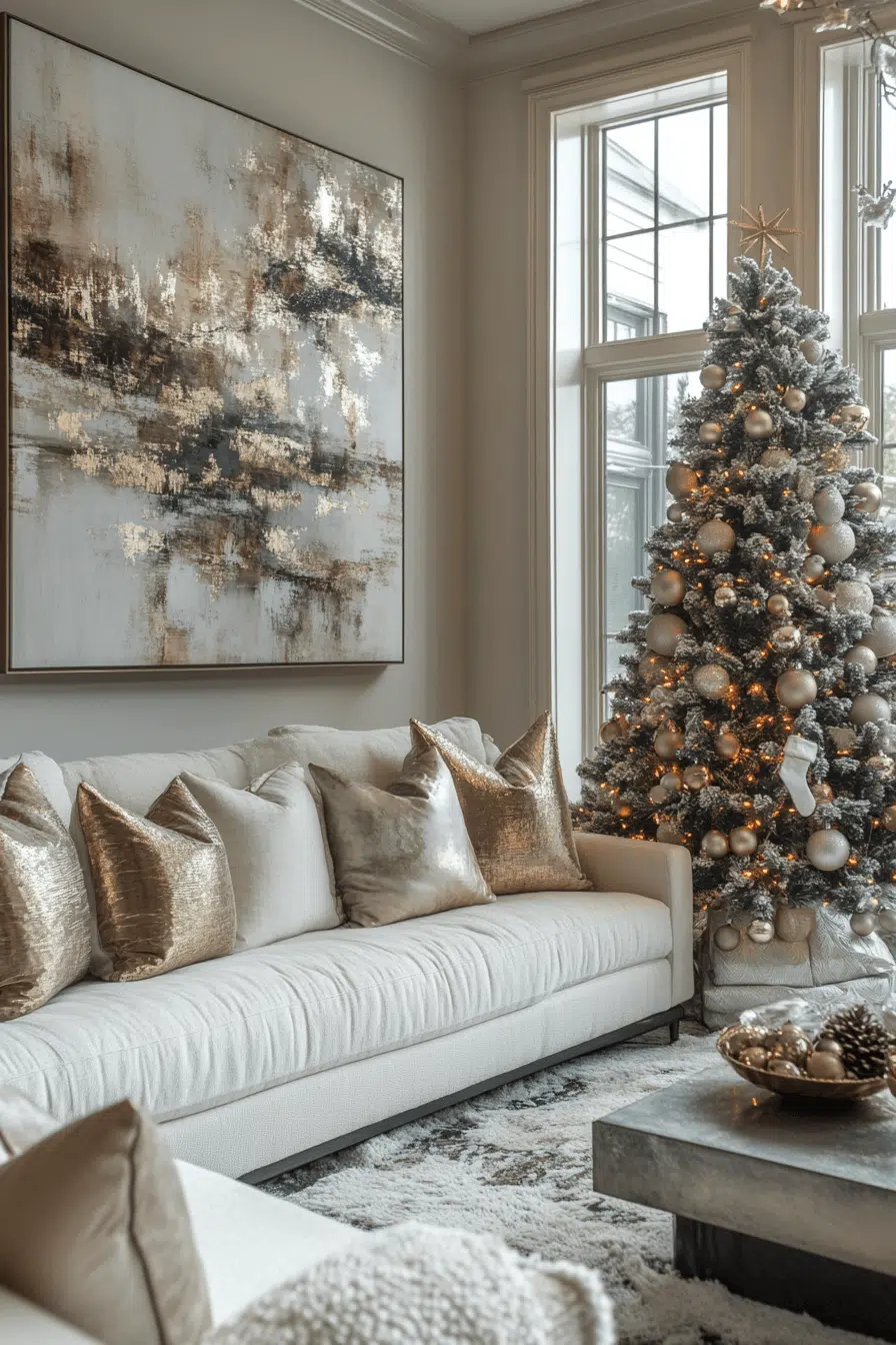 Elevate your lounge with Christmas decorating ideas that mix modern art with cozy touches. Sculptural trees, metallic accents, and soft fabrics create balance. Choose muted tones for effortless elegance. The look feels trendy but timeless. Add a touch of luxury to your lounging space and let modern magic unfold.