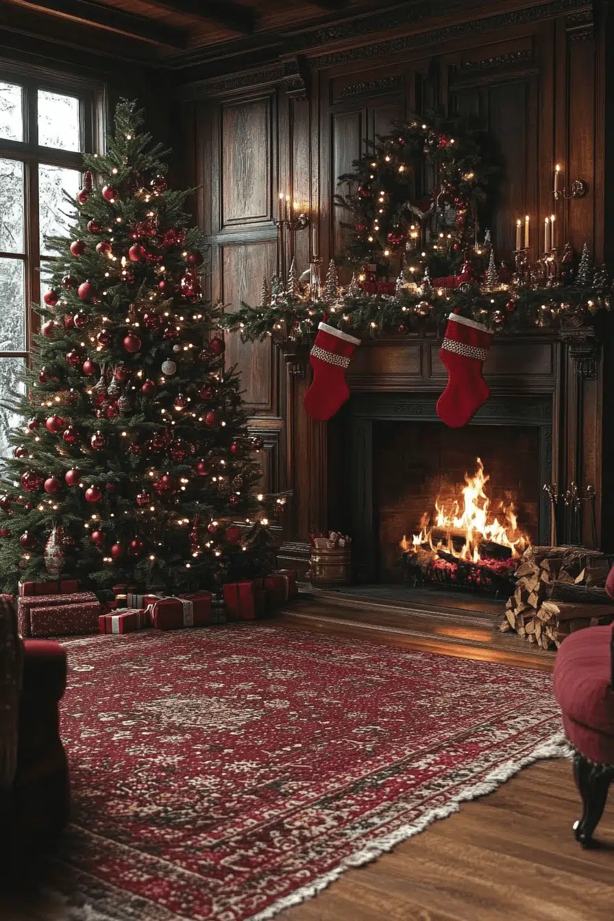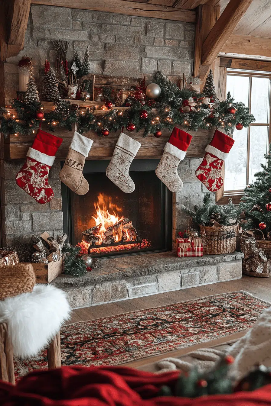 Make your fireplace the star of your home with Christmas decorating ideas that radiate rustic warmth. Layer evergreen garlands, wooden ornaments, and soft stockings for a classic look. Candles and pinecones bring natural charm. It’s cozy yet refined. Gather by the fire and let your holiday spirit burn bright.