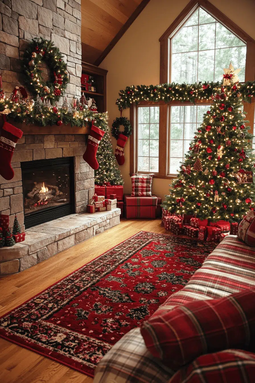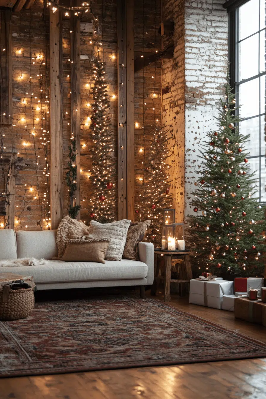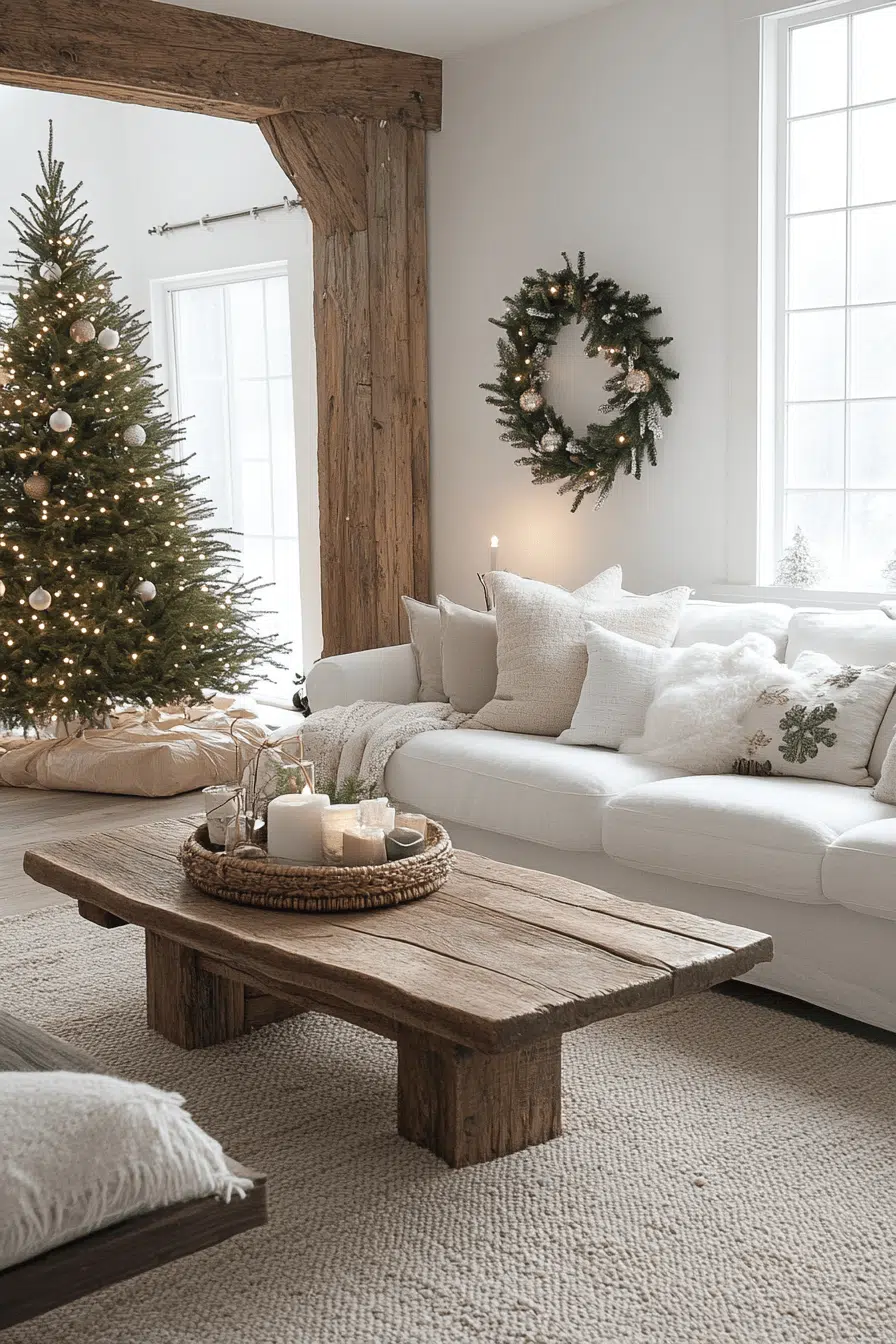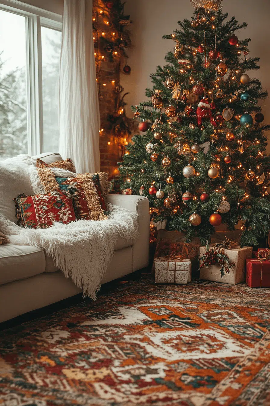 Wrap your living room in cozy comfort using Christmas decorating ideas that balance charm and relaxation. Layer chunky blankets, textured pillows, and warm fairy lights to create a cocoon of comfort. A decorated tree anchors the room with sparkle and style. Add candles for that irresistible holiday glow. Turn your living room into a space that feels like a hug wrapped in Christmas cheer.